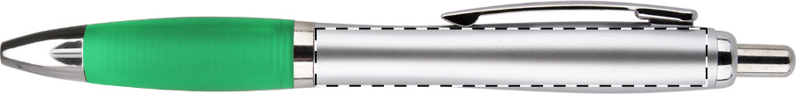 Kunststoff-Kugelschreiber mit silbernem Schaft und farbiger Gummi-Griffzone, blauschreibend.