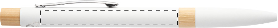 Kugelschreiber aus recyceltem Aluminium mit Bambus-Elementen, gummierter Oberfläche und verchromten Clip. Mit Spezialbeschichtung für Spiegelgravuren. Blauschreibend.