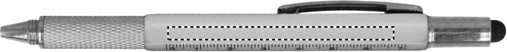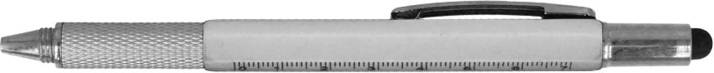 Drehkugelschreiber mit Stylus, aufgedrucktem Lineal und Mini-Wasserwaage (Gimmick),sowie integriertem Kreuz- und Schlitzschraubenzieher. Schwarze Tinte.
