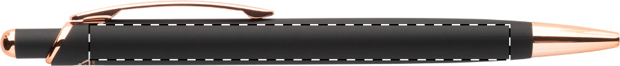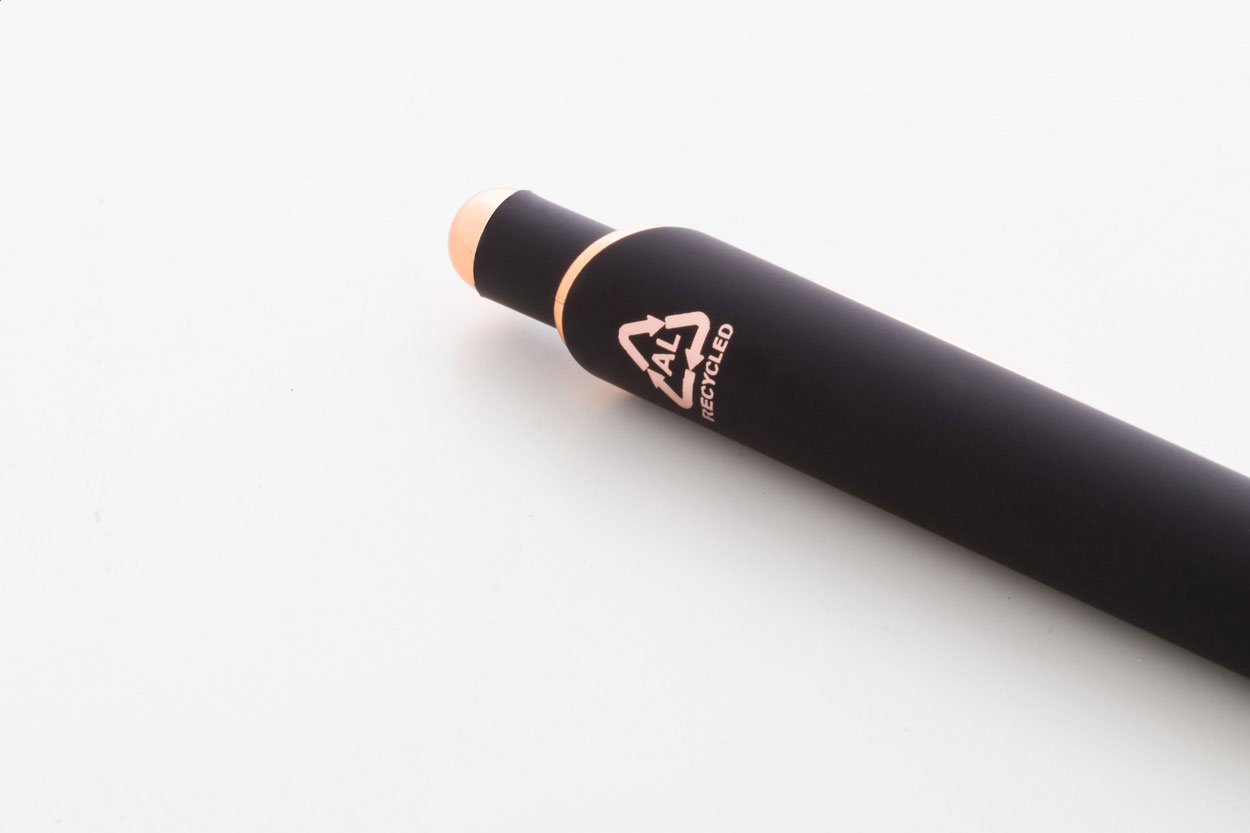 Kugelschreiber aus recyceltem Aluminium mit gummierter Oberfläche und rosagoldenen Elemnten Mit Spezialbeschichtung für rosagoldfarbene Spiegelgravuren. Blauschreibend.
