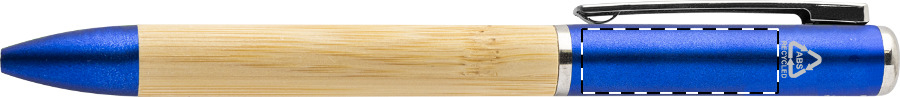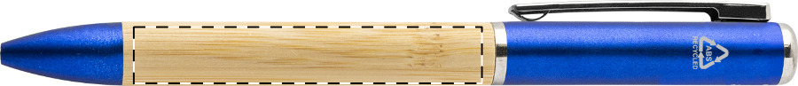 Kugelschreiber aus recyceltem Aluminium mit Bambus-Elementen, gummierter Oberfläche und verchromten Clip. Mit Spezialbeschichtung für Spiegelgravuren. Blauschreibend.Maße: ø10×138 mmSchreibgerät-Typ: KugelschreiberSchreibfarbe: BlauMaterial: Recycletes Aluminium, BambusVeredelungsposition 1: Korpus - rechts vom ClipTechnologie: GravurDurchmesser: 0Druckcode: E1Technologie: Gravur - EinzelnamenDurchmesser: 0Druckcode: NE1Technologie: UV-LED-Druck - EinzelnamenDurchmesser: 0Druckcode: NUVBTechnologie: TampondruckMaximale Farben: 4Durchmesser: 0Druckcode: P1Technologie: UV LED DruckDurchmesser: 0Druckcode: UVBVeredelungsposition 2: Korpus - links vom ClipTechnologie: GravurDurchmesser: 0Druckcode: E1Technologie: Gravur - EinzelnamenDurchmesser: 0Druckcode: NE1Technologie: UV-LED-Druck - EinzelnamenDurchmesser: 0Druckcode: NUVBTechnologie: TampondruckMaximale Farben: 4Durchmesser: 0Druckcode: P1Technologie: UV LED DruckDurchmesser: 0Druckcode: UVB