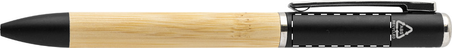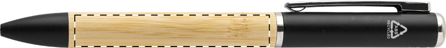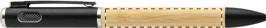Drehkugelschreiber aus Bambus und recyceltem ABS Kunststoff mit 1 LED Taschenlampe (inkl. Knopfzellenbatterie). Blauschreibend.Maße: ø12×147 mmSchreibgerät-Typ: KugelschreiberSchreibgerät-Mechanik: DrehmechanikSchreibfarbe: BlauMaterial: Bambus, Recycelter ABS-KunststoffVeredelungsposition 1: Rechts vom ClipTechnologie: GravurDurchmesser: 0Druckcode: E1Technologie: Gravur - EinzelnamenDurchmesser: 0Druckcode: NE1Technologie: TampondruckMaximale Farben: 4Durchmesser: 0Druckcode: P1Veredelungsposition 2: Links vom ClipTechnologie: GravurDurchmesser: 0Druckcode: E1Technologie: Gravur - EinzelnamenDurchmesser: 0Druckcode: NE1Technologie: TampondruckMaximale Farben: 4Durchmesser: 0Druckcode: P1Veredelungsposition 3: Korpus - rechts vom ClipTechnologie: GravurDurchmesser: 0Druckcode: E1Technologie: Gravur - EinzelnamenDurchmesser: 0Druckcode: NE1Technologie: TampondruckMaximale Farben: 4Durchmesser: 0Druckcode: P1Veredelungsposition 4: Korpus - links vom ClipTechnologie: GravurDurchmesser: 0Druckcode: E1Technologie: Gravur - EinzelnamenDurchmesser: 0Druckcode: NE1Technologie: TampondruckMaximale Farben: 4Durchmesser: 0Druckcode: P1