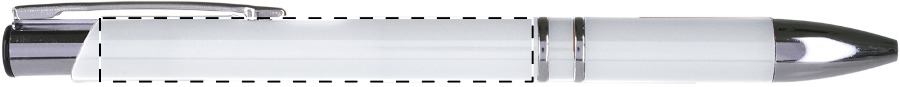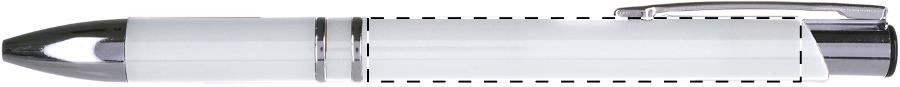 Weißer Kunststoff-Kugelschreiber mit farbigem Clip, blauschreibend.Maße: ø10×138 mmSchreibgerät-Typ: KugelschreiberSchreibgerät-Mechanik: DruckmechanikSchreibfarbe: BlauMinentyp: Normale MineLinienstärke: 1 mmMaterial: Kunststoff (ABS)Veredelungsposition 1: Korpus - rechts vom ClipTechnologie: UV-LED-Druck - EinzelnamenDurchmesser: 0Druckcode: NUVATechnologie: TampondruckMaximale Farben: 4Durchmesser: 0Druckcode: P0Technologie: TampondruckMaximale Farben: 1Durchmesser: 0Druckcode: P1Technologie: UV LED DruckDurchmesser: 0Druckcode: UVAVeredelungsposition 2: Korpus - links vom ClipTechnologie: UV-LED-Druck - EinzelnamenDurchmesser: 0Druckcode: NUVATechnologie: TampondruckMaximale Farben: 4Durchmesser: 0Druckcode: P0Technologie: TampondruckMaximale Farben: 1Durchmesser: 0Druckcode: P1Technologie: UV LED DruckDurchmesser: 0Druckcode: UVAVeredelungsposition 3: KlipTechnologie: TampondruckMaximale Farben: 4Durchmesser: 0Druckcode: P0Veredelungsposition 4: Korpus - in Verlängerung vom ClipTechnologie: TampondruckMaximale Farben: 4Durchmesser: 0Druckcode: P0