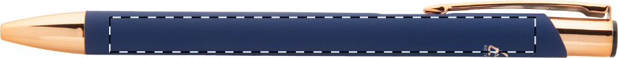 Kugelschreiber aus recyceltem Aluminium, mit gummierter Oberfläche und roségoldenen Elementen. Mit Spezialbeschichtung für Spiegelgravur in Roségold, blauschreibend.