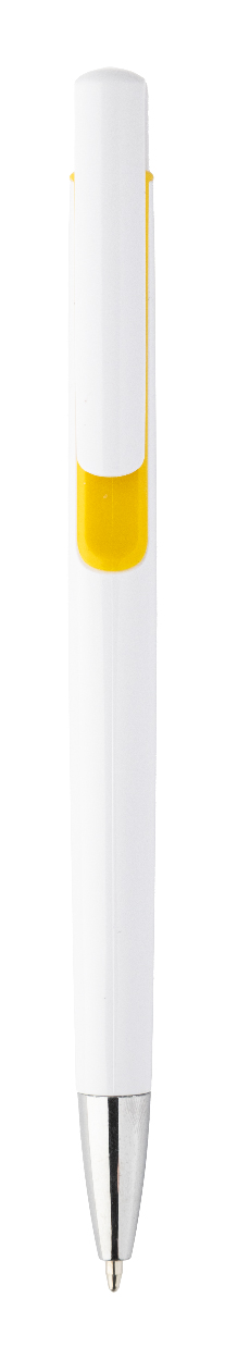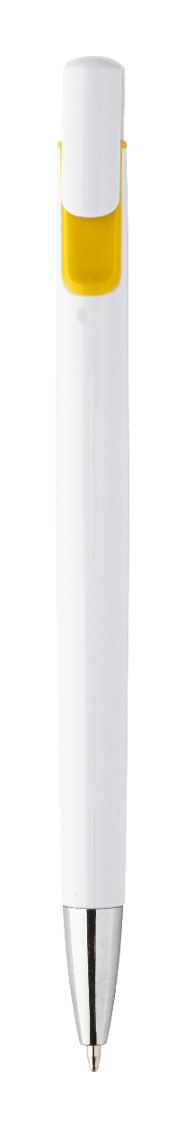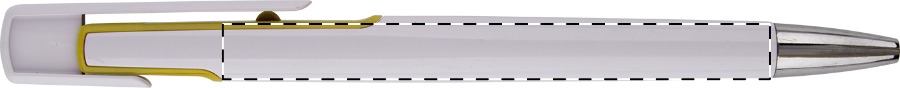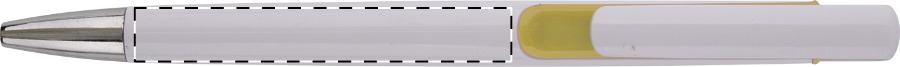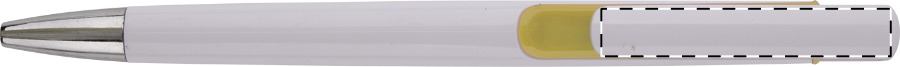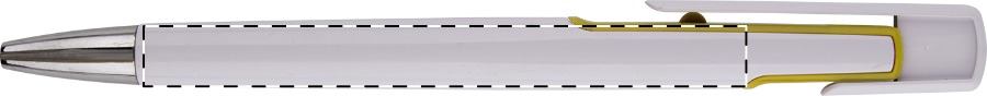 Weißer Kunststoff-Kugelschreiber mit farbigem Clip, blauschreibend.Maße: ø10×138 mmSchreibgerät-Typ: KugelschreiberSchreibgerät-Mechanik: DruckmechanikSchreibfarbe: BlauMinentyp: Normale MineLinienstärke: 1 mmMaterial: Kunststoff (ABS)Veredelungsposition 1: Korpus - rechts vom ClipTechnologie: UV-LED-Druck - EinzelnamenDurchmesser: 0Druckcode: NUVATechnologie: TampondruckMaximale Farben: 4Durchmesser: 0Druckcode: P0Technologie: TampondruckMaximale Farben: 1Durchmesser: 0Druckcode: P1Technologie: UV LED DruckDurchmesser: 0Druckcode: UVAVeredelungsposition 2: Korpus - links vom ClipTechnologie: UV-LED-Druck - EinzelnamenDurchmesser: 0Druckcode: NUVATechnologie: TampondruckMaximale Farben: 4Durchmesser: 0Druckcode: P0Technologie: TampondruckMaximale Farben: 1Durchmesser: 0Druckcode: P1Technologie: UV LED DruckDurchmesser: 0Druckcode: UVAVeredelungsposition 3: KlipTechnologie: TampondruckMaximale Farben: 4Durchmesser: 0Druckcode: P0Veredelungsposition 4: Korpus - in Verlängerung vom ClipTechnologie: TampondruckMaximale Farben: 4Durchmesser: 0Druckcode: P0