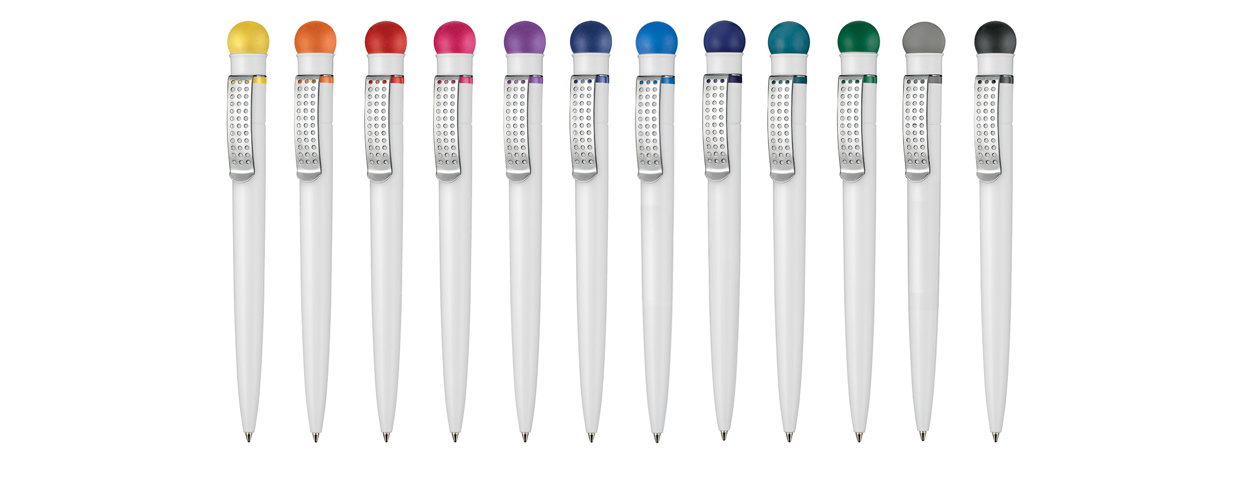 Einzigartiges Design. Dieser in Deutschland gefertigte Druckkugelschreiber verfügt über einen flexiblen Gummiballdrücker. Außerdem ist er mit einem äußerst stabilen und wertigen Edelstahlclip im Lochdesign ausgestattet. Der Schaft bietet eine große, ununterbrochene Werbefläche. Für ein stets einwandfreies Schriftbild sorgt eine Qualitätsmine Jogger.
