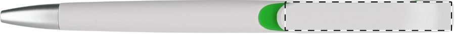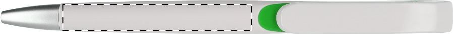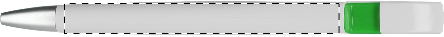 Weißer Kunststoff-Kugelschreiber mit farbigem Clip, blauschreibend.Maße: ø10×138 mmSchreibgerät-Typ: KugelschreiberSchreibgerät-Mechanik: DruckmechanikSchreibfarbe: BlauMinentyp: Normale MineLinienstärke: 1 mmMaterial: Kunststoff (ABS)Veredelungsposition 1: Korpus - rechts vom ClipTechnologie: UV-LED-Druck - EinzelnamenDurchmesser: 0Druckcode: NUVATechnologie: TampondruckMaximale Farben: 4Durchmesser: 0Druckcode: P0Technologie: TampondruckMaximale Farben: 1Durchmesser: 0Druckcode: P1Technologie: UV LED DruckDurchmesser: 0Druckcode: UVAVeredelungsposition 2: Korpus - links vom ClipTechnologie: UV-LED-Druck - EinzelnamenDurchmesser: 0Druckcode: NUVATechnologie: TampondruckMaximale Farben: 4Durchmesser: 0Druckcode: P0Technologie: TampondruckMaximale Farben: 1Durchmesser: 0Druckcode: P1Technologie: UV LED DruckDurchmesser: 0Druckcode: UVAVeredelungsposition 3: KlipTechnologie: TampondruckMaximale Farben: 4Durchmesser: 0Druckcode: P0Veredelungsposition 4: Korpus - in Verlängerung vom ClipTechnologie: TampondruckMaximale Farben: 4Durchmesser: 0Druckcode: P0