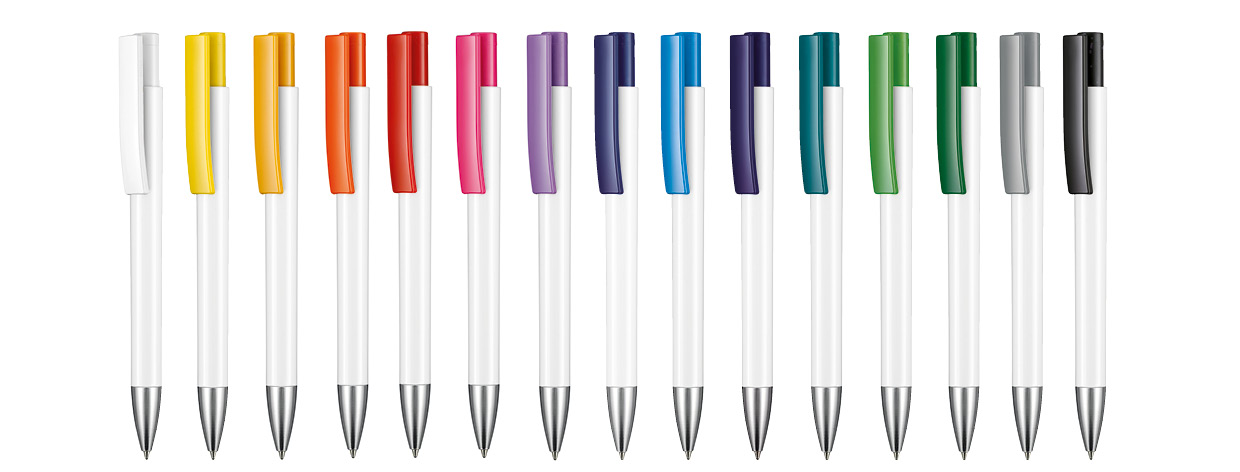 Weißer Kunststoff-Kugelschreiber mit farbigem Clip, blauschreibend.Maße: ø10×138 mmSchreibgerät-Typ: KugelschreiberSchreibgerät-Mechanik: DruckmechanikSchreibfarbe: BlauMinentyp: Normale MineLinienstärke: 1 mmMaterial: Kunststoff (ABS)Veredelungsposition 1: Korpus - rechts vom ClipTechnologie: UV-LED-Druck - EinzelnamenDurchmesser: 0Druckcode: NUVATechnologie: TampondruckMaximale Farben: 4Durchmesser: 0Druckcode: P0Technologie: TampondruckMaximale Farben: 1Durchmesser: 0Druckcode: P1Technologie: UV LED DruckDurchmesser: 0Druckcode: UVAVeredelungsposition 2: Korpus - links vom ClipTechnologie: UV-LED-Druck - EinzelnamenDurchmesser: 0Druckcode: NUVATechnologie: TampondruckMaximale Farben: 4Durchmesser: 0Druckcode: P0Technologie: TampondruckMaximale Farben: 1Durchmesser: 0Druckcode: P1Technologie: UV LED DruckDurchmesser: 0Druckcode: UVAVeredelungsposition 3: KlipTechnologie: TampondruckMaximale Farben: 4Durchmesser: 0Druckcode: P0Veredelungsposition 4: Korpus - in Verlängerung vom ClipTechnologie: TampondruckMaximale Farben: 4Durchmesser: 0Druckcode: P0