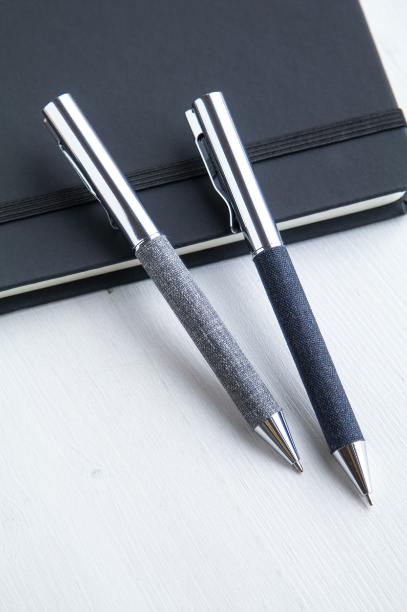 Drehkugelschreiber aus Metall mit einer Ummantelung aus RPET Polyester in einem farblich abgestimmten Etui aus RPET Polyester, blauschreibend.