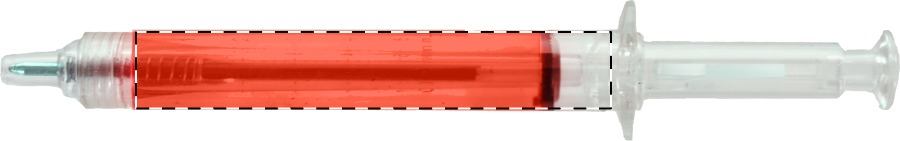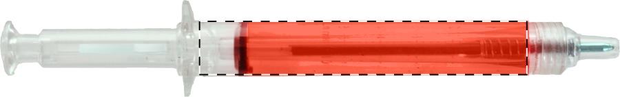 Kugelschreiber in Spritzenform mit flüssigkeitsgefülltem transparenten Gehäuse, blauschreibend.Maße: ø11×127 mmSchreibgerät-Typ: KugelschreiberSchreibfarbe: BlauLinienstärke: 1 mmMaterial: KunststoffVeredelungsposition 1: Für LinkshänderTechnologie: TampondruckMaximale Farben: 4Durchmesser: 0Druckcode: P1Veredelungsposition 2: Für RechtshänderTechnologie: TampondruckMaximale Farben: 4Durchmesser: 0Druckcode: P1