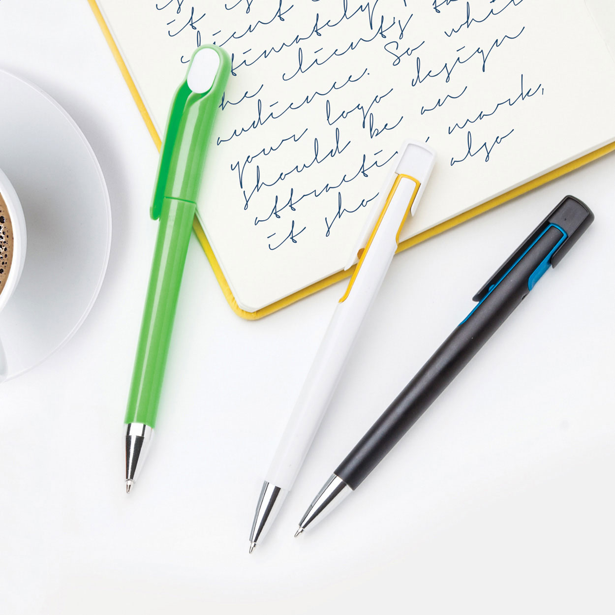 Weißer Kunststoff-Kugelschreiber mit farbigem Clip, blauschreibend.Maße: ø10×138 mmSchreibgerät-Typ: KugelschreiberSchreibgerät-Mechanik: DruckmechanikSchreibfarbe: BlauMinentyp: Normale MineLinienstärke: 1 mmMaterial: Kunststoff (ABS)Veredelungsposition 1: Korpus - rechts vom ClipTechnologie: UV-LED-Druck - EinzelnamenDurchmesser: 0Druckcode: NUVATechnologie: TampondruckMaximale Farben: 4Durchmesser: 0Druckcode: P0Technologie: TampondruckMaximale Farben: 1Durchmesser: 0Druckcode: P1Technologie: UV LED DruckDurchmesser: 0Druckcode: UVAVeredelungsposition 2: Korpus - links vom ClipTechnologie: UV-LED-Druck - EinzelnamenDurchmesser: 0Druckcode: NUVATechnologie: TampondruckMaximale Farben: 4Durchmesser: 0Druckcode: P0Technologie: TampondruckMaximale Farben: 1Durchmesser: 0Druckcode: P1Technologie: UV LED DruckDurchmesser: 0Druckcode: UVAVeredelungsposition 3: KlipTechnologie: TampondruckMaximale Farben: 4Durchmesser: 0Druckcode: P0Veredelungsposition 4: Korpus - in Verlängerung vom ClipTechnologie: TampondruckMaximale Farben: 4Durchmesser: 0Druckcode: P0