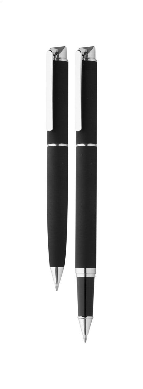 Metall-Schreibset mit gummierter Oberfläche, bestehend aus Kugelschreiber, schwarzschreibend, und Rollerball. Einzeln in Geschenkbox mit Magnetverschluss.