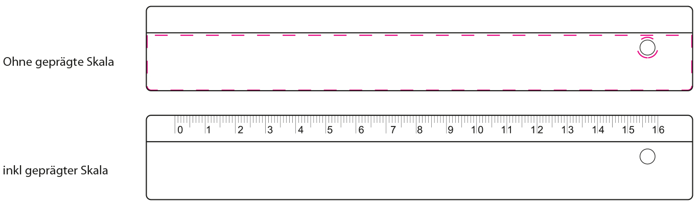 Stabiles 16 cm langes Lineal aus Kunststoff mit erhaben geprägter mm-Skala auf einer Seite. Standardmäßig ohne Druck. Loch auf einer Seite.