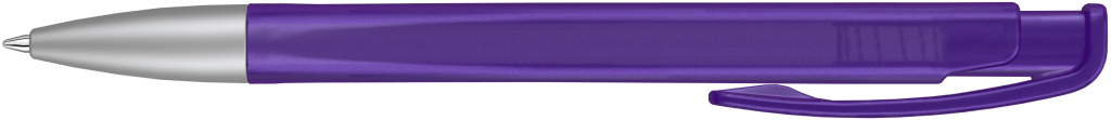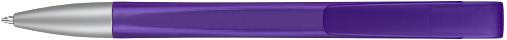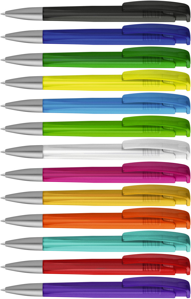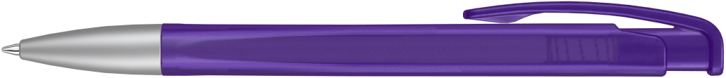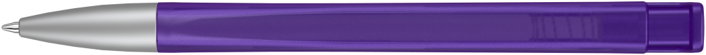 Druckkugelschreiber mit geometrisch wechselnder Schaftform, transparent gefrostetem Gehäuse und Metallspitze matt verchromt.