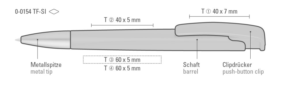 Druckbereich: Auf dem Clip 40mm x 7mm Tampondruck (T), in Clipverlängerung 40mm x 5mm Tampondruck (T), gegenüber vom Clip 60mm x 5mm Tampondruck (T), seitlich vom Clip 60mm x 5mm Tampondruck (T)