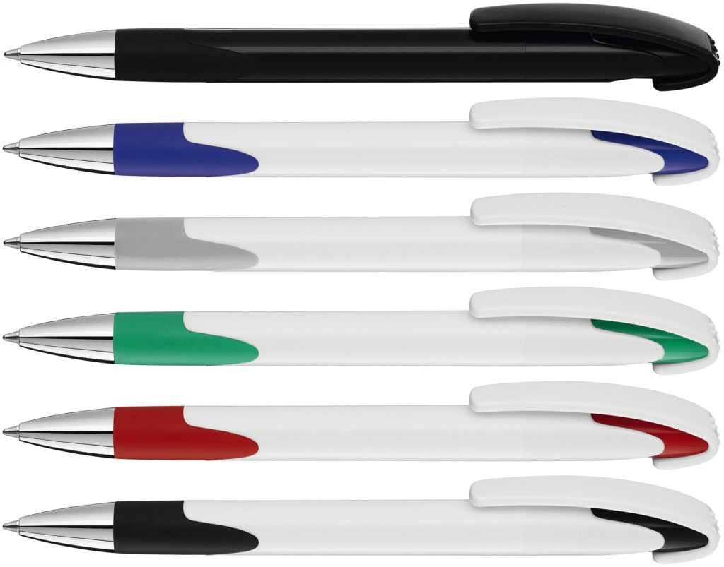 Weißer Kunststoff-Kugelschreiber mit farbigem Clip, blauschreibend.Maße: ø10×138 mmSchreibgerät-Typ: KugelschreiberSchreibgerät-Mechanik: DruckmechanikSchreibfarbe: BlauMinentyp: Normale MineLinienstärke: 1 mmMaterial: Kunststoff (ABS)Veredelungsposition 1: Korpus - rechts vom ClipTechnologie: UV-LED-Druck - EinzelnamenDurchmesser: 0Druckcode: NUVATechnologie: TampondruckMaximale Farben: 4Durchmesser: 0Druckcode: P0Technologie: TampondruckMaximale Farben: 1Durchmesser: 0Druckcode: P1Technologie: UV LED DruckDurchmesser: 0Druckcode: UVAVeredelungsposition 2: Korpus - links vom ClipTechnologie: UV-LED-Druck - EinzelnamenDurchmesser: 0Druckcode: NUVATechnologie: TampondruckMaximale Farben: 4Durchmesser: 0Druckcode: P0Technologie: TampondruckMaximale Farben: 1Durchmesser: 0Druckcode: P1Technologie: UV LED DruckDurchmesser: 0Druckcode: UVAVeredelungsposition 3: KlipTechnologie: TampondruckMaximale Farben: 4Durchmesser: 0Druckcode: P0Veredelungsposition 4: Korpus - in Verlängerung vom ClipTechnologie: TampondruckMaximale Farben: 4Durchmesser: 0Druckcode: P0