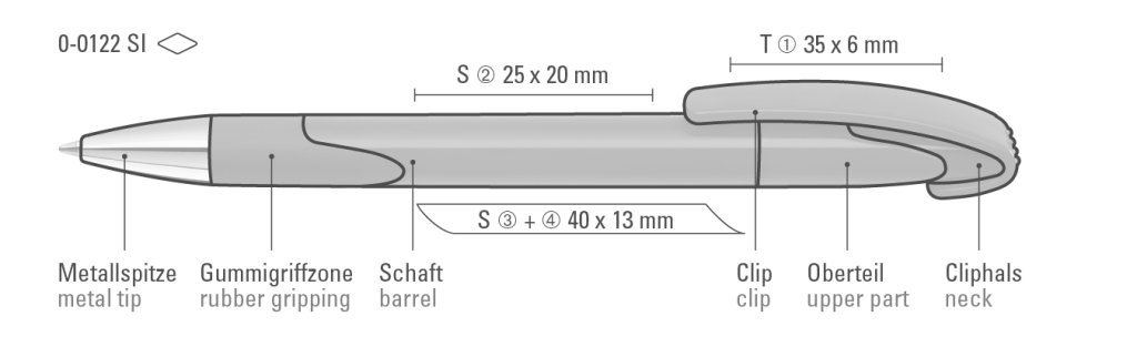 Druckbereich: Auf dem Clip 35mm x 6mm Tampondruck (T), in Clipverlängerung 25mm x 20mm Siebdruck (S), gegenüber vom Clip 40mm x 13mm Siebdruck (S), seitlich vom Clip 40mm x 13mm Siebdruck (S)