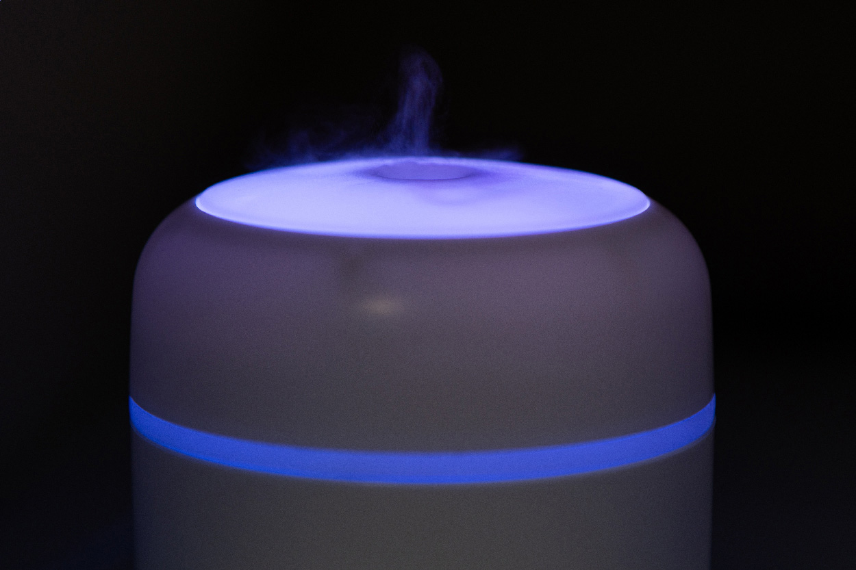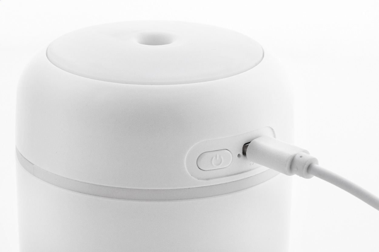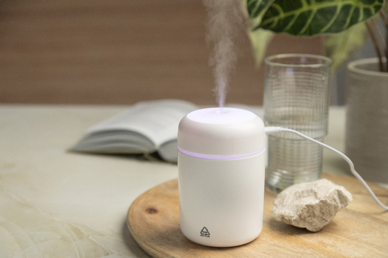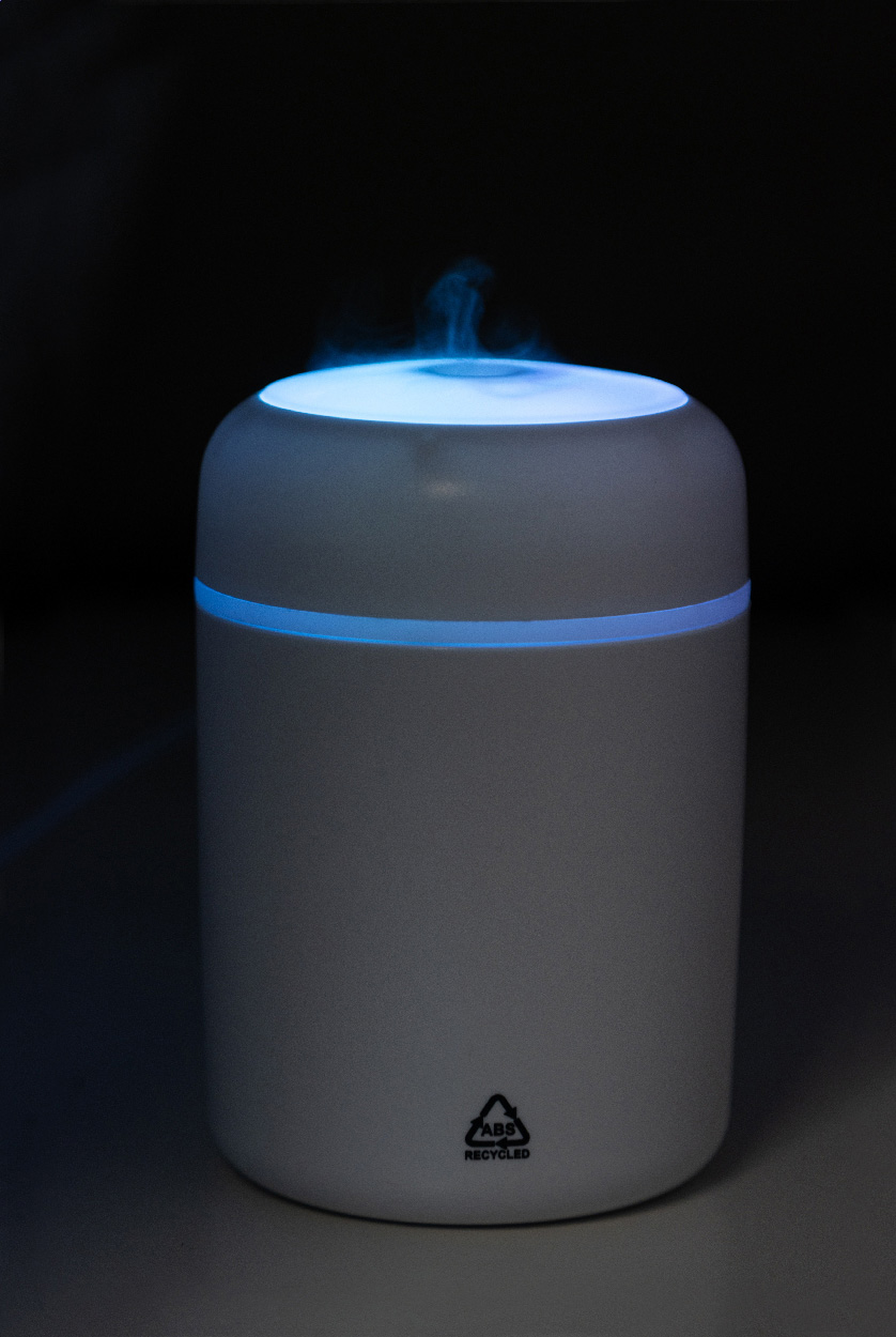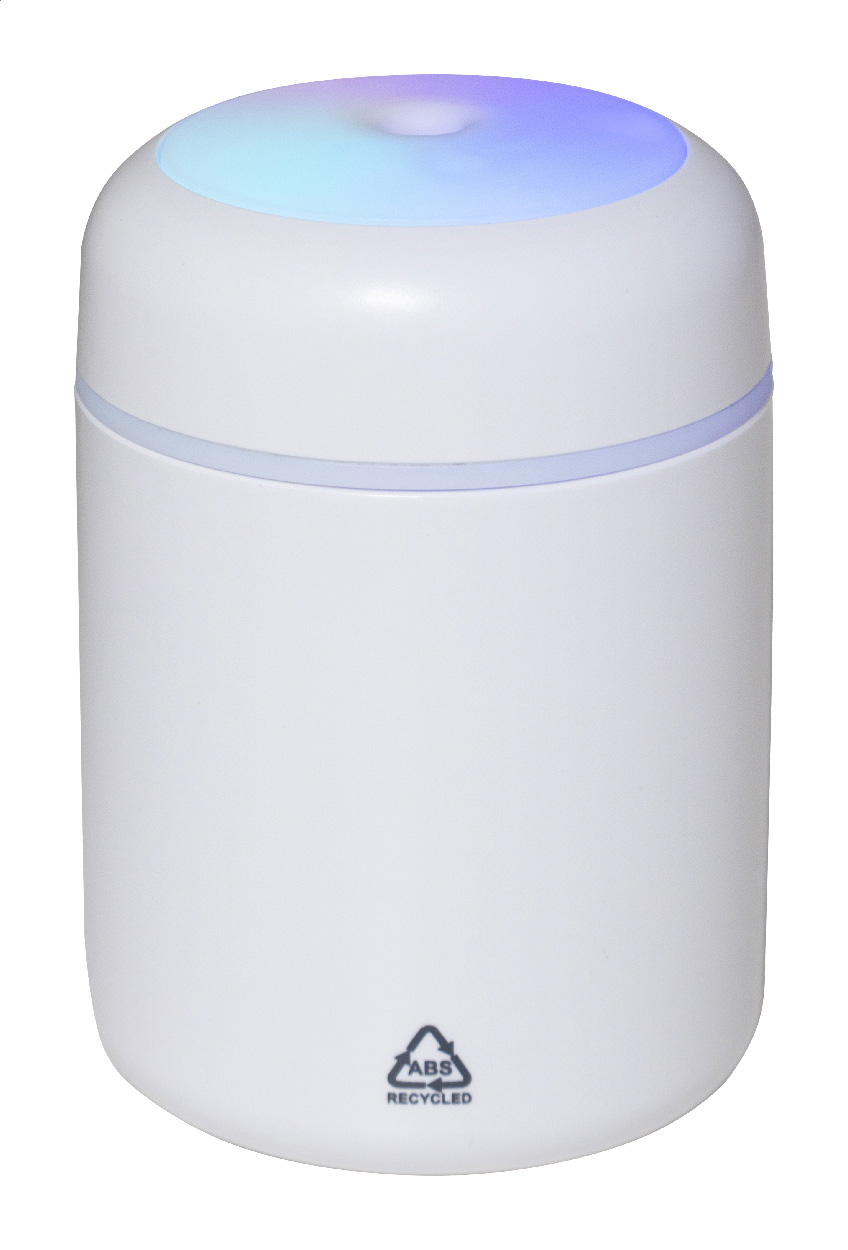 Tisch-Luftbefeuchter aus recyceltem ABS mit mehrfarbigem LED-Licht. Inklusive USB-Ladekabel. Tankinhalt: 280 ml.