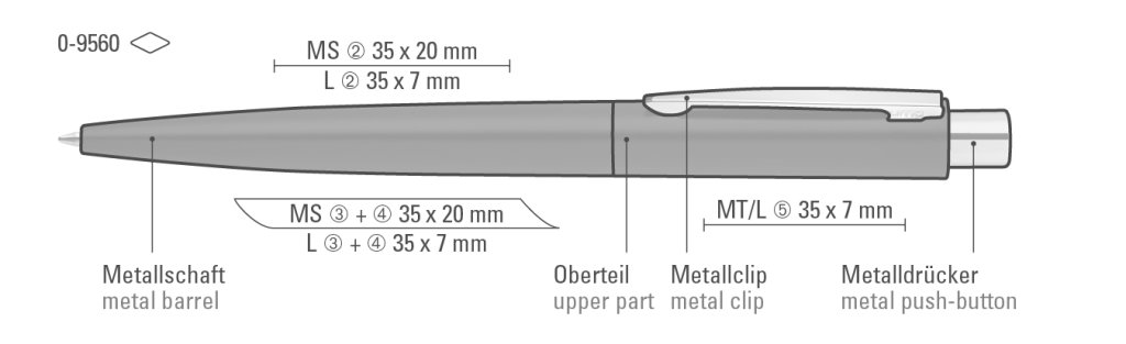 Druckbereich: In Clipverlängerung 35mm x 20mm Siebdruck (MS), in Clipverlängerung 35mm x 7mm Lasergravur (L), seitlich vom Clip 35mm x 20mm Siebdruck (MS), seitlich vom Clip 35mm x 7mm Lasergravur (L), auf der Kappe/auf dem Oberteil 35mm x 7mm Tampondruck (MT), auf der Kappe/auf dem Oberteil 35mm x 7mm Lasergravur (L), gegenüber vom Clip 35mm x 20mm Siebdruck (MS), gegenüber vom Clip 35mm x 7mm Lasergravur (L), in Clipverlängerung 35mm x 7mm Einzelnamensgravur (EL), seitlich vom Clip 35mm x 7mm Einzelnamensgravur (EL), auf der Kappe/auf dem Oberteil 35mm x 7mm Einzelnamensgravur (EL), gegenüber vom Clip 35mm x 7mm Einzelnamensgravur (EL)