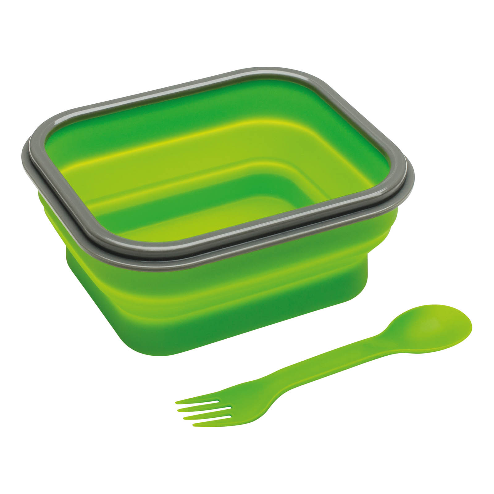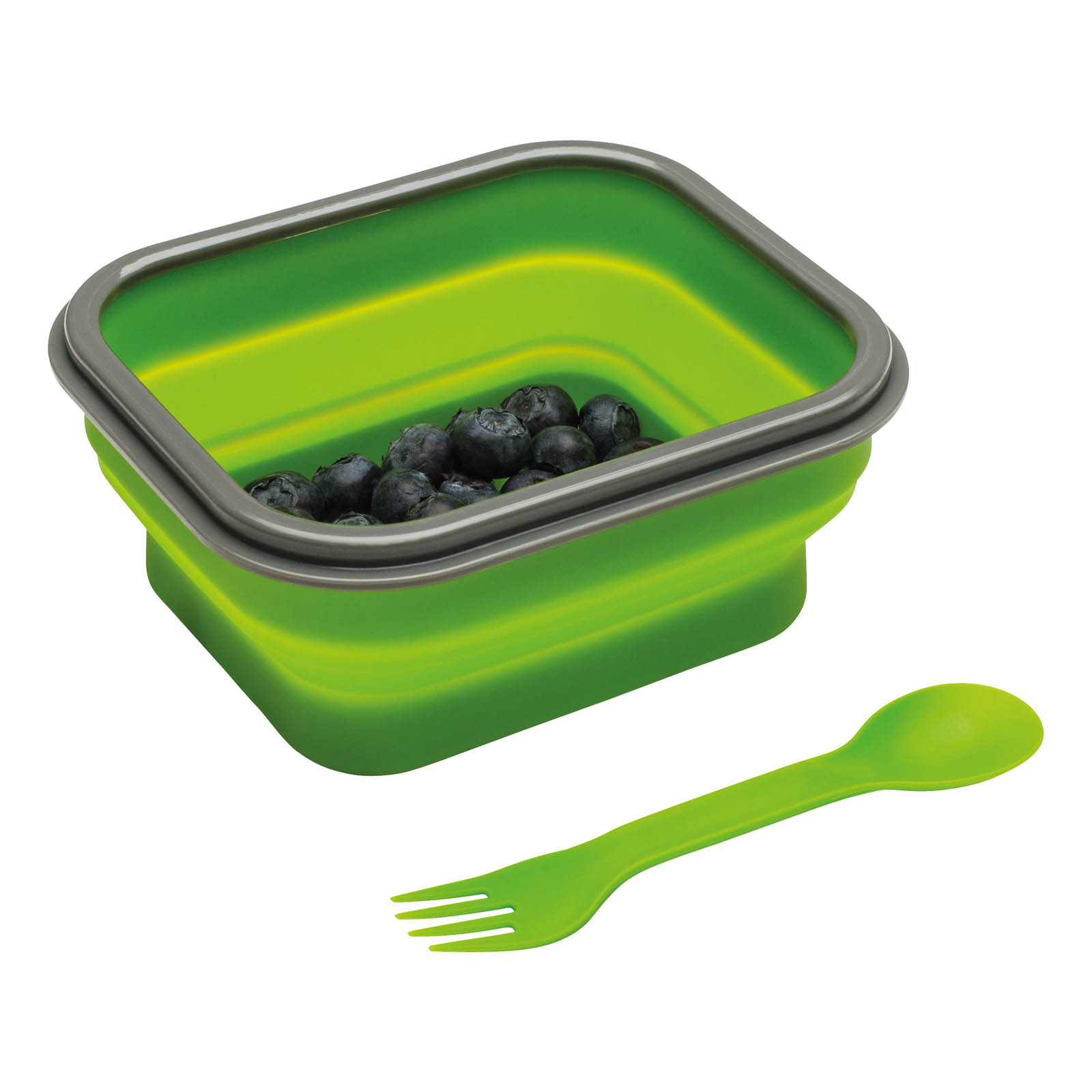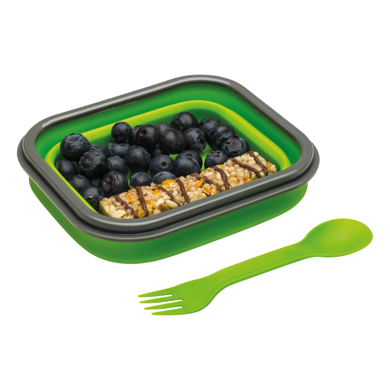 Praktisch, weil platzsparend: Faltbarer Speisebehälter aus Silikon mit einem Einzelfach und Löffel und Gabel in Besteckhalterung. Mikowellengeeignet.