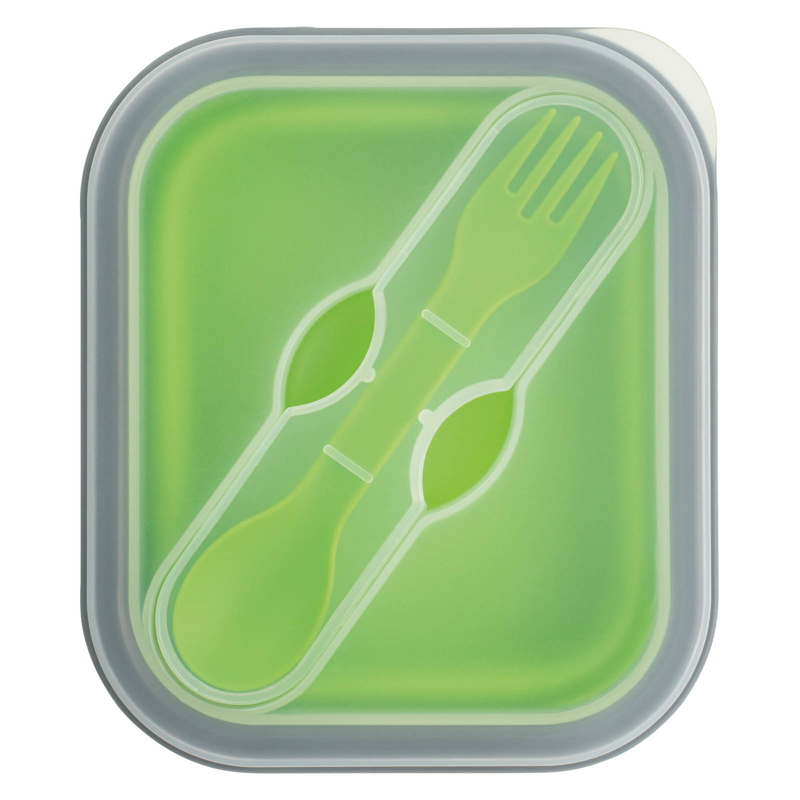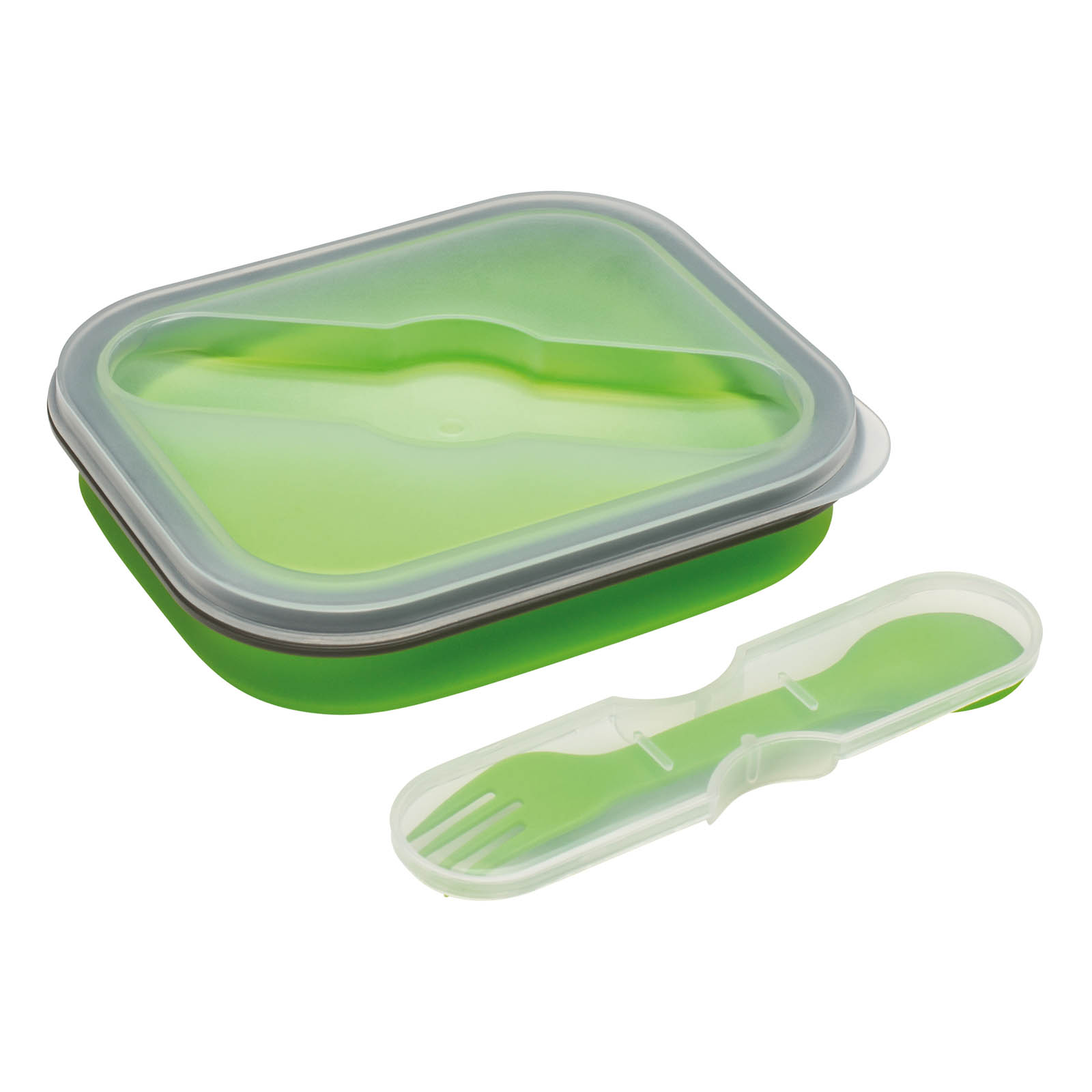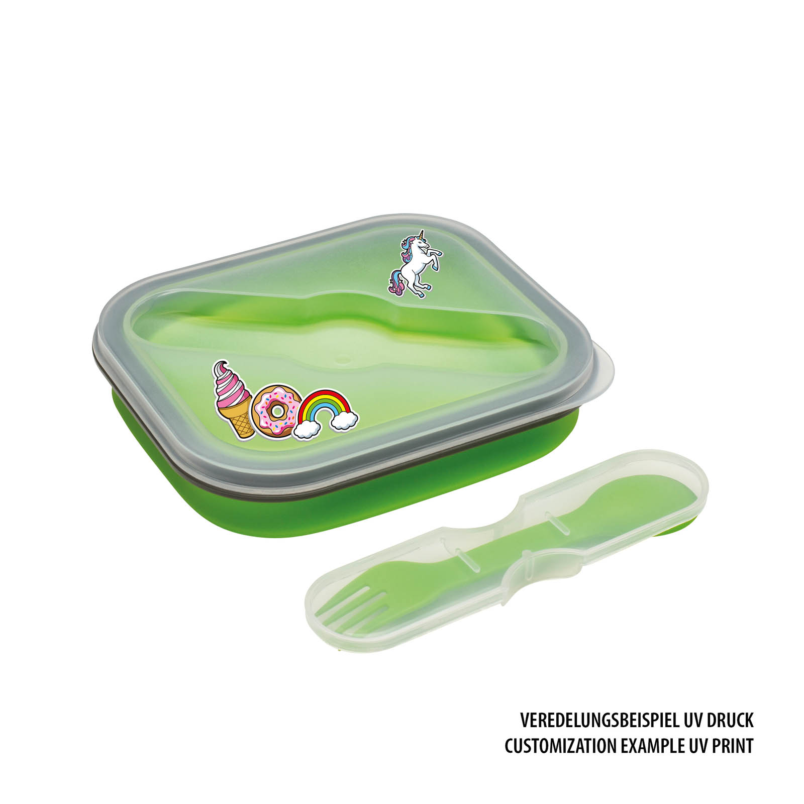 Für die Pausenmahlzeit oder fürs Picknick: Platzsparender, faltbarer Speisenbehälter aus Silikon mit Einzelfach und Löffel und Gabel in Besteckhalterung. Mikrowellengeeignet.Kunststoff, Silikon, hellgrün, Gabel, Löffel, Polybeutel, Spülmaschinen geeignetFormat: MFarbe: hellgrünGewicht: 225,5 gFormat in mm: 207 (L) x 132 (B) x 39 (H)Veredelungsvarianten: Tampondruck (1c), Papiereinleger, Tampondruck (2c), UV Druck 4Druckfläche: 105 x 20 mmHandling: BMaterial: Kunststoff, SilikonFarbe: hellgrünGröße: M