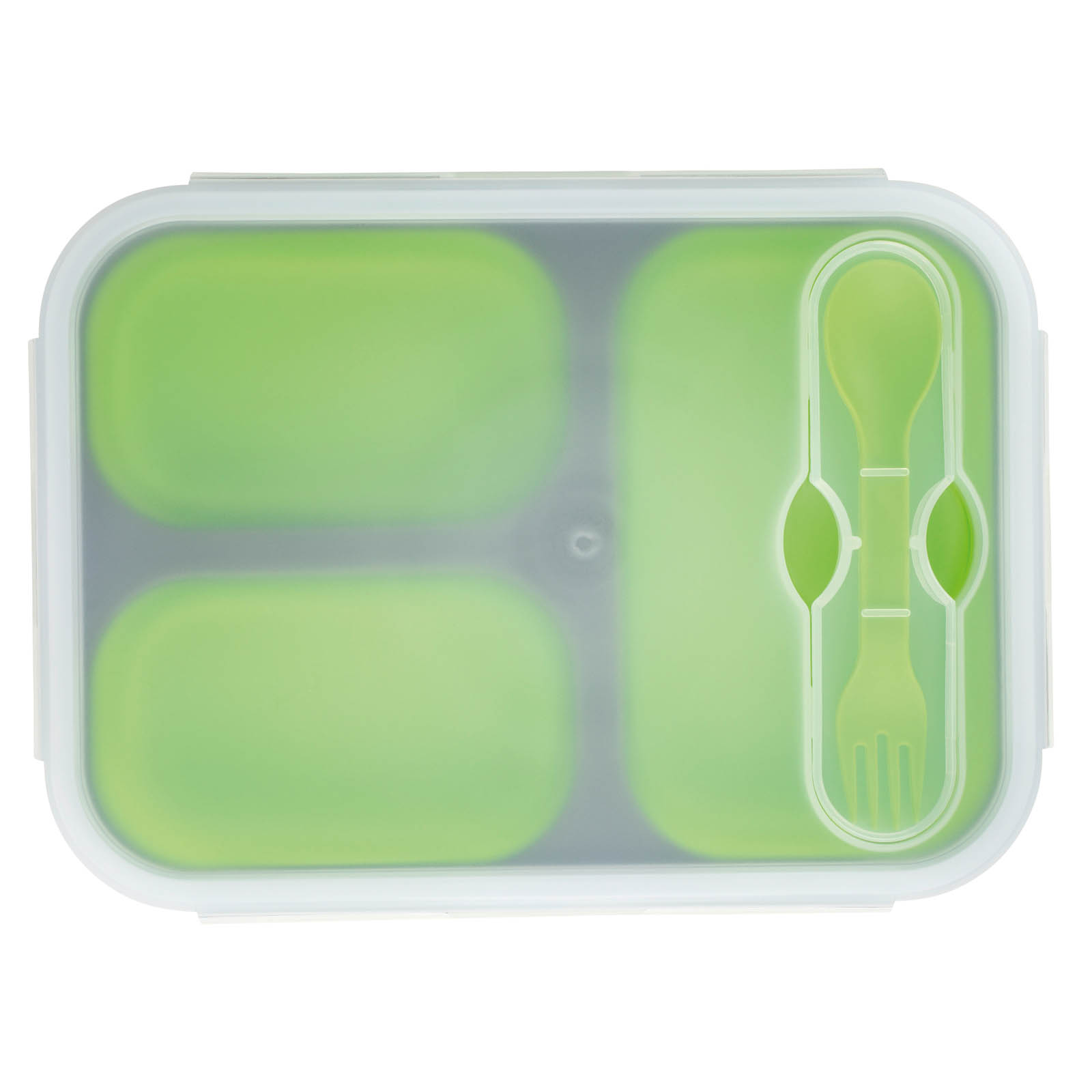 Hier passt viel rein! Faltbarer, platzsparender Speisenbehälter aus Silikon mit drei Fächern für den Pausensnack und Mittagessen. Inklusive Löffel und Gabel im Besteckhalterung. Mikrowellengeeignet.