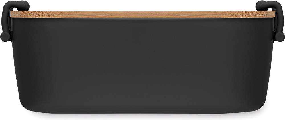 Lunchbox aus PP mit Deckel aus Bambus. 2 seitliche Halteklammern. Füllmenge: 700 ml.