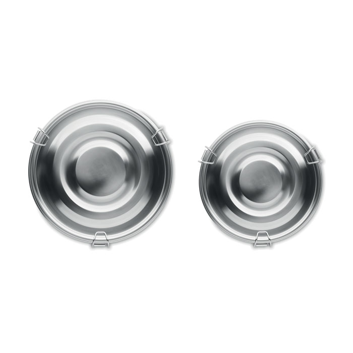 Lunchboxen-Set aus Edelstahl mit starken Halteklammern. Füllmenge: 450 ml und 900 ml.