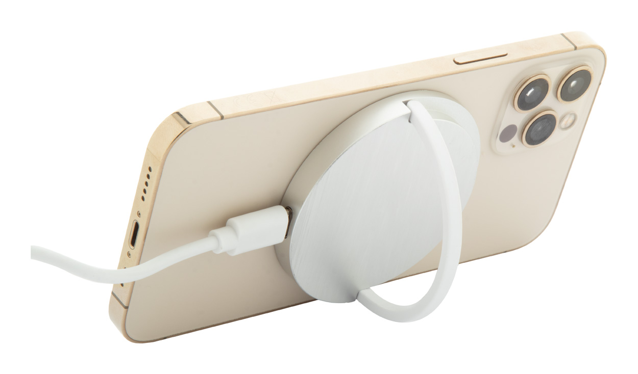 Magnetischer Wireless-Fastcharger (15W) aus recyceltem Aluminium und RABS-Kunststoff mit Handyhalterring. Kompatibel mit iPhone® 12 oder neuer. Inkl. USB-Ladekabel.