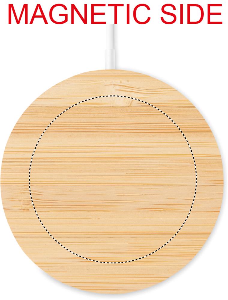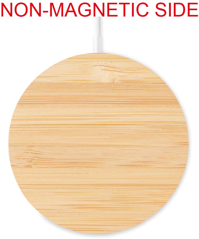 Induktives, magnetisches Ladegerät aus Bambus. Ausgang: DC 9V/1.1A (10W) für schnelles Aufladen. Kompatibel mit iPhone® 12 und neuer. Inkl. magnetischem Metallring zur Unterstützung anderer nicht-magnetischer wireless aufladbarer Telefone. Bambus ist ein natürliches Produkt, es kann daher zu leichten Abweichungen in Farbe, Dekor und Maßen kommen.