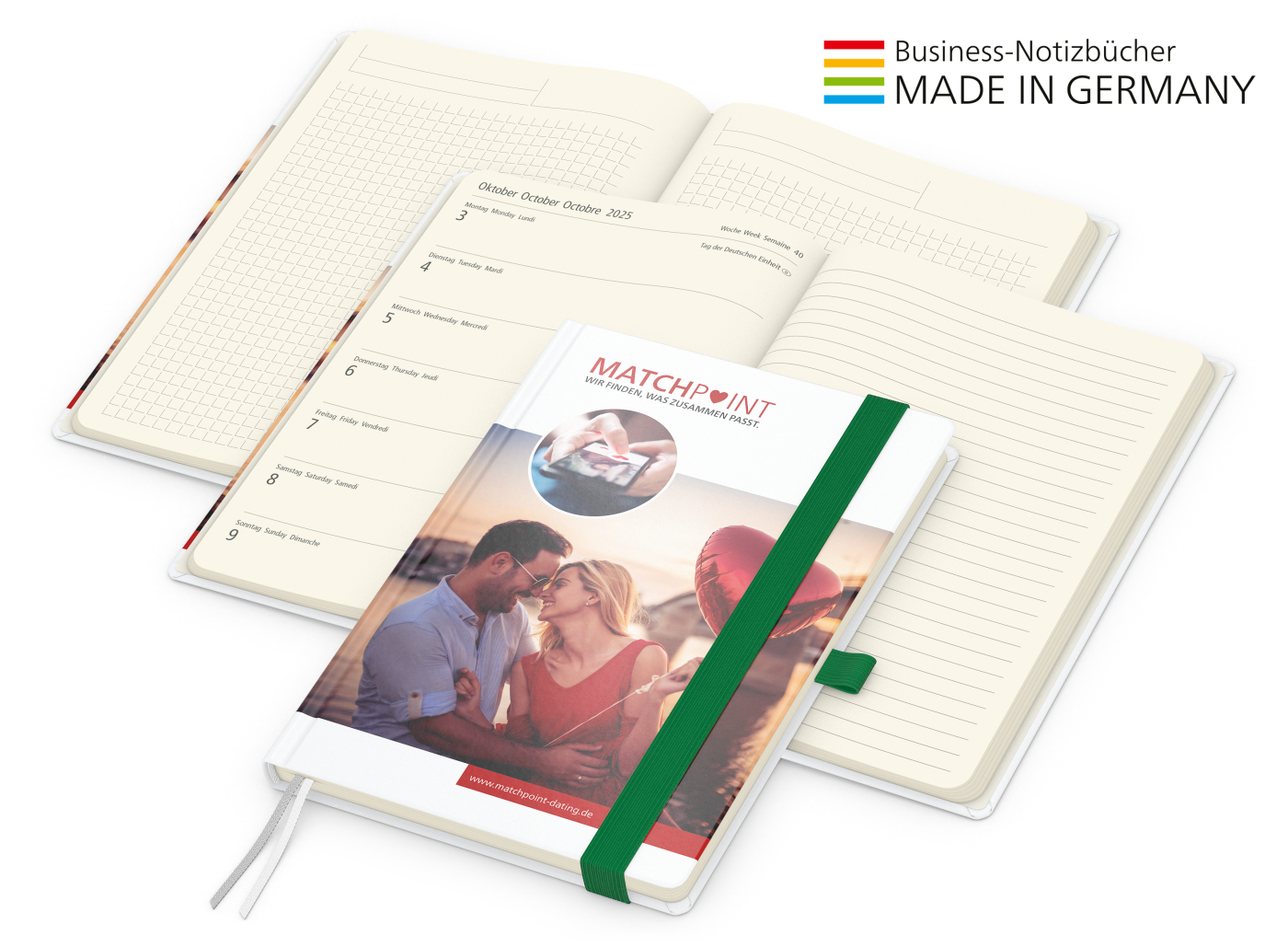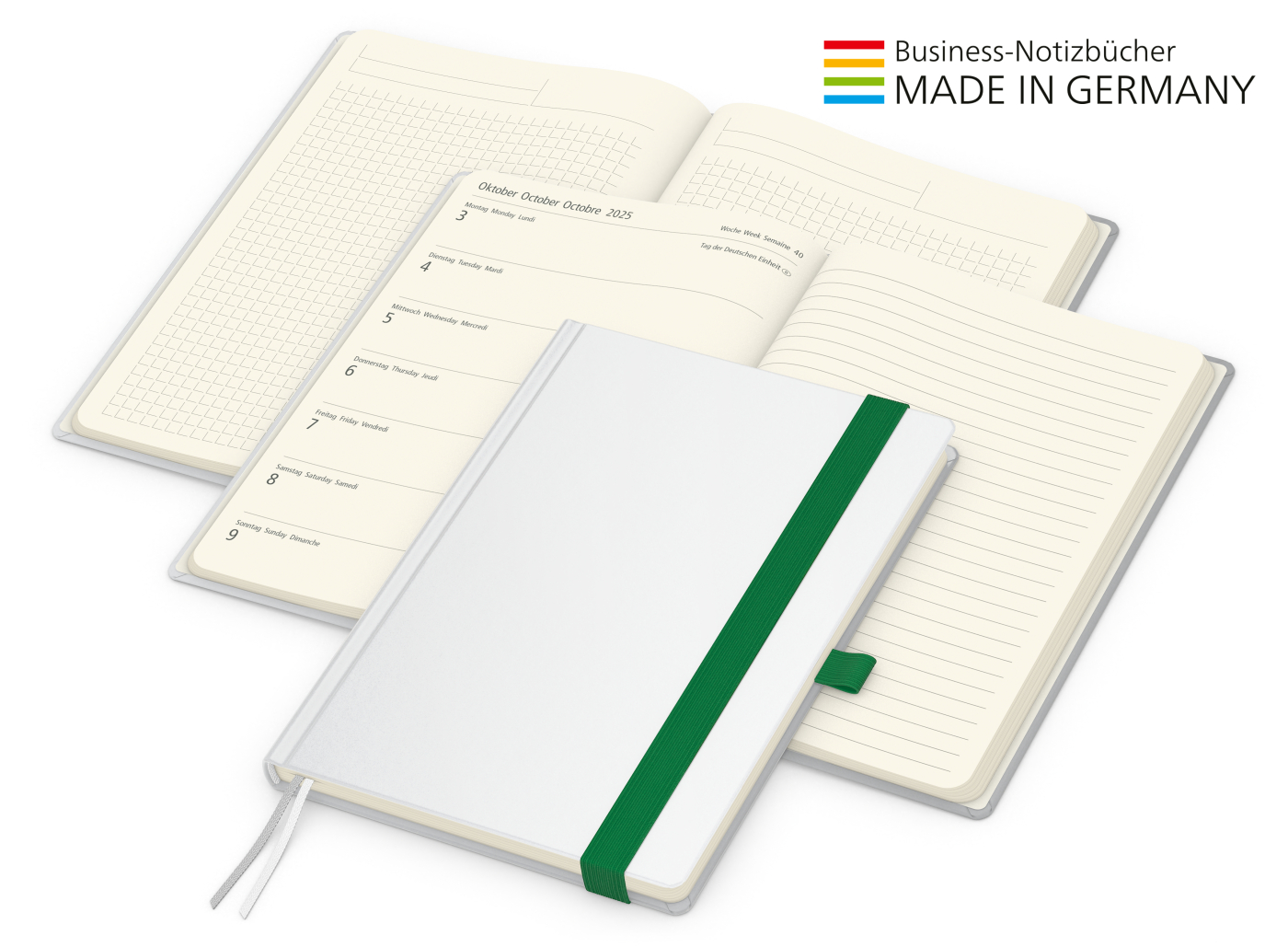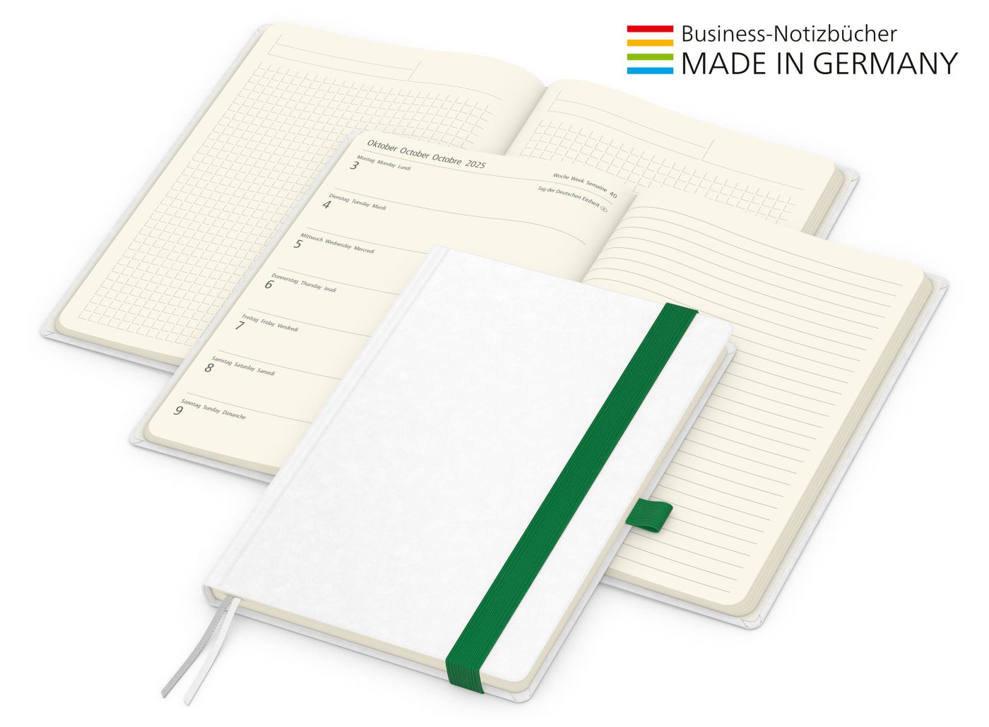 Der Hybrid-Timer für jedes Corporate Design mit cremefarbenem Inhaltspapier. Individuell bedruckter Einband kombiniert mit Gummiband und Stiftschlaufe in Wunschfarbe. Wochenkalendarium von August 2024 - Dezember 2025