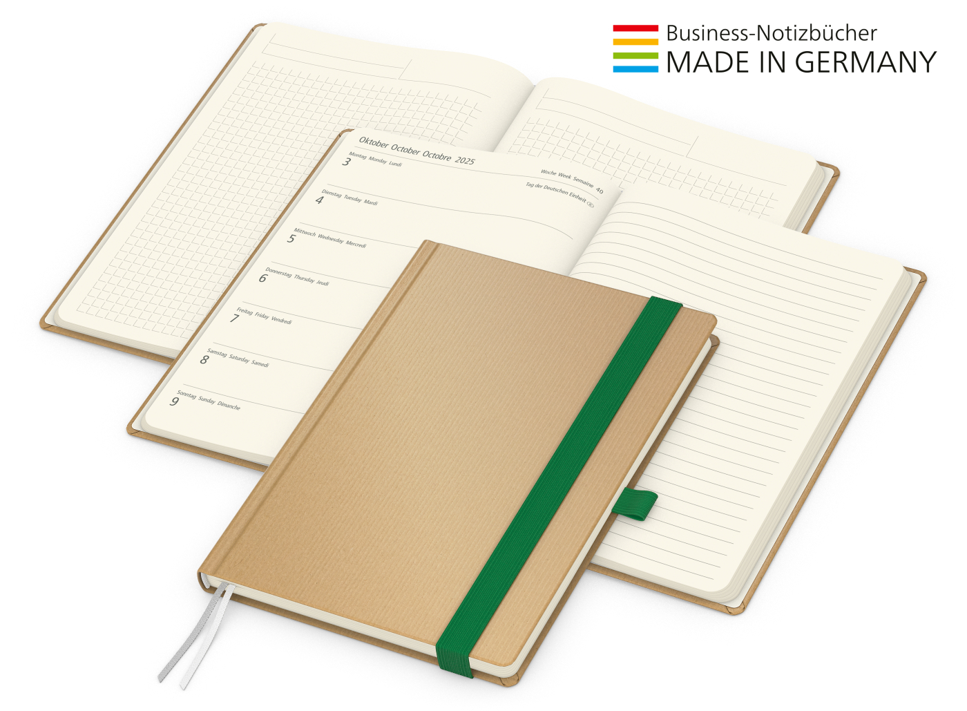 Der Hybrid-Timer für jedes Corporate Design mit cremefarbenem Inhaltspapier. Individuell bedruckter Einband kombiniert mit Gummiband und Stiftschlaufe in Wunschfarbe. Wochenkalendarium von August 2024 - Dezember 2025
