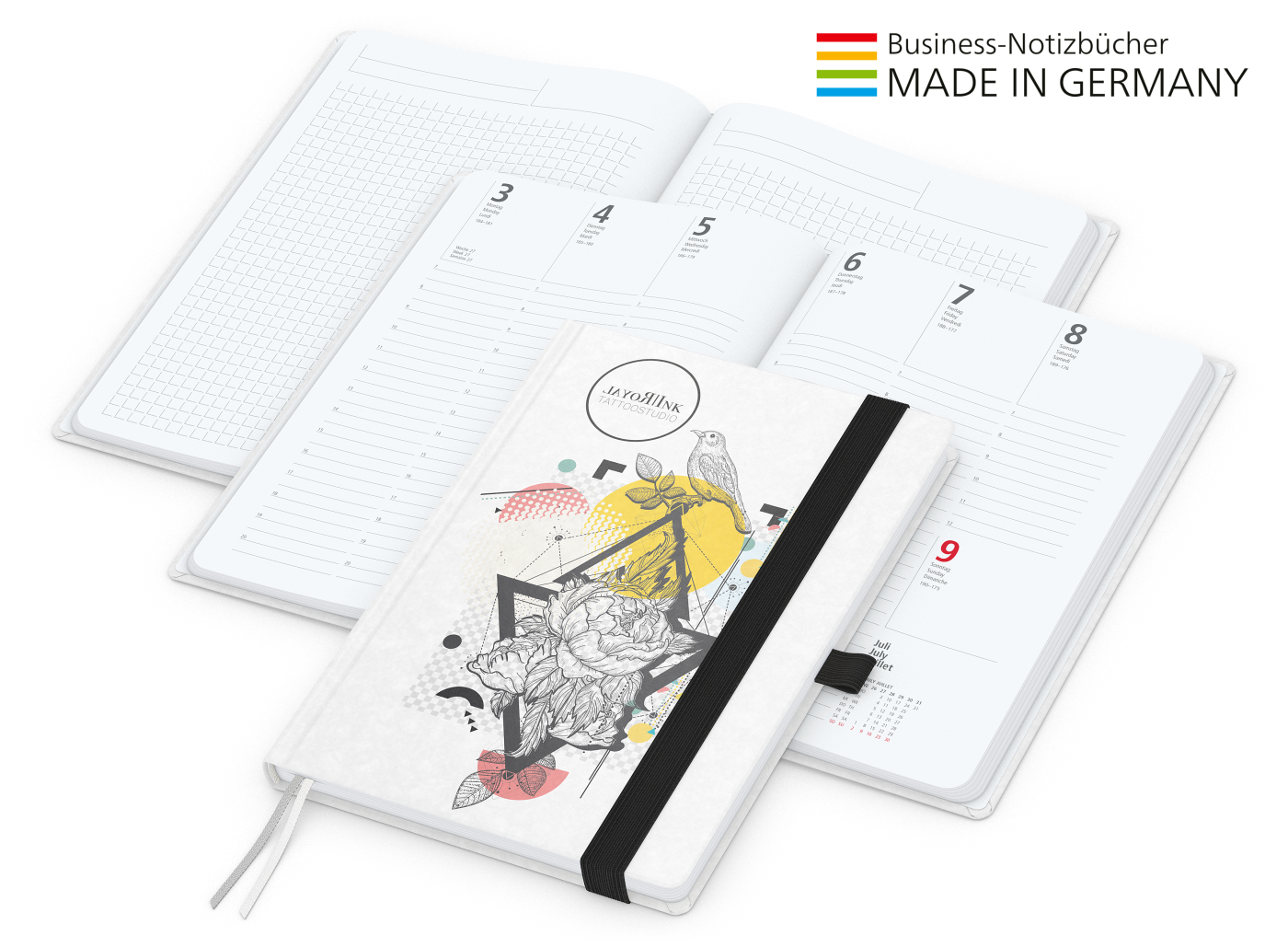Der Hybrid-Timer für jedes Corporate Design. Individuell bedruckter Einband kombiniert mit Gummiband und Stiftschlaufe in Wunschfarbe. Wochenkalendarium Hochweiß über ein Jahr oder für A5 auch in Creme von August 2024 bis Dezember 2025.