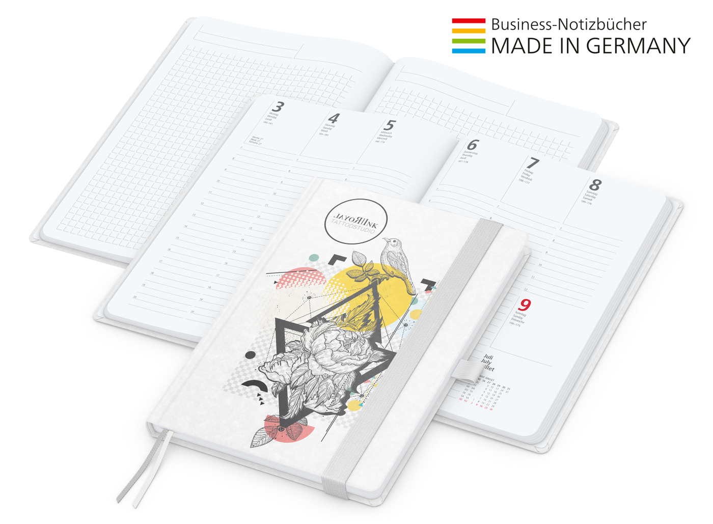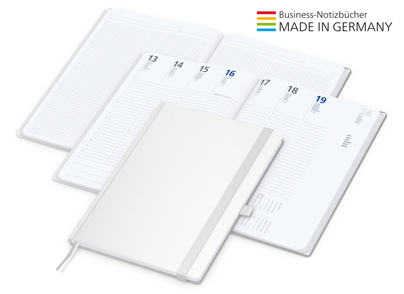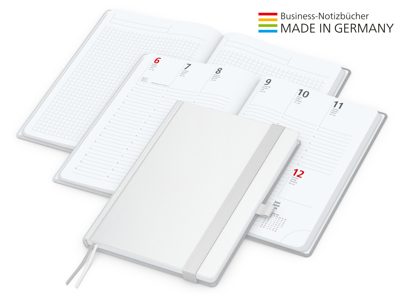 Der Hybrid-Timer für jedes Corporate Design. Individuell bedruckter Einband kombiniert mit Gummiband und Stiftschlaufe in Wunschfarbe. Wochenkalendarium Hochweiß über ein Jahr oder für A5 auch in Creme von August 2024 bis Dezember 2025.