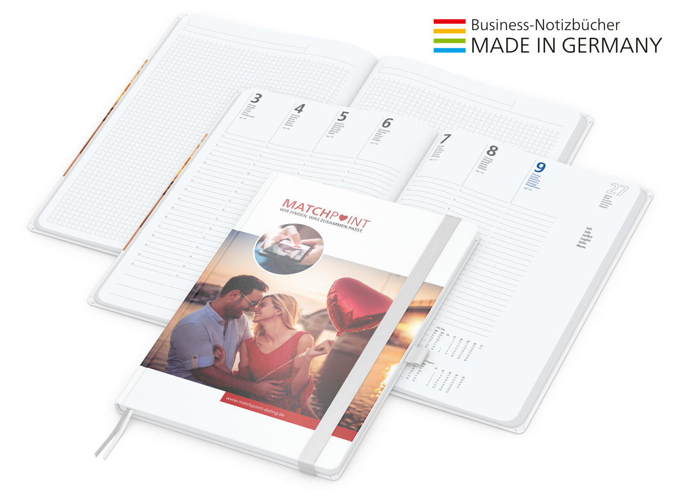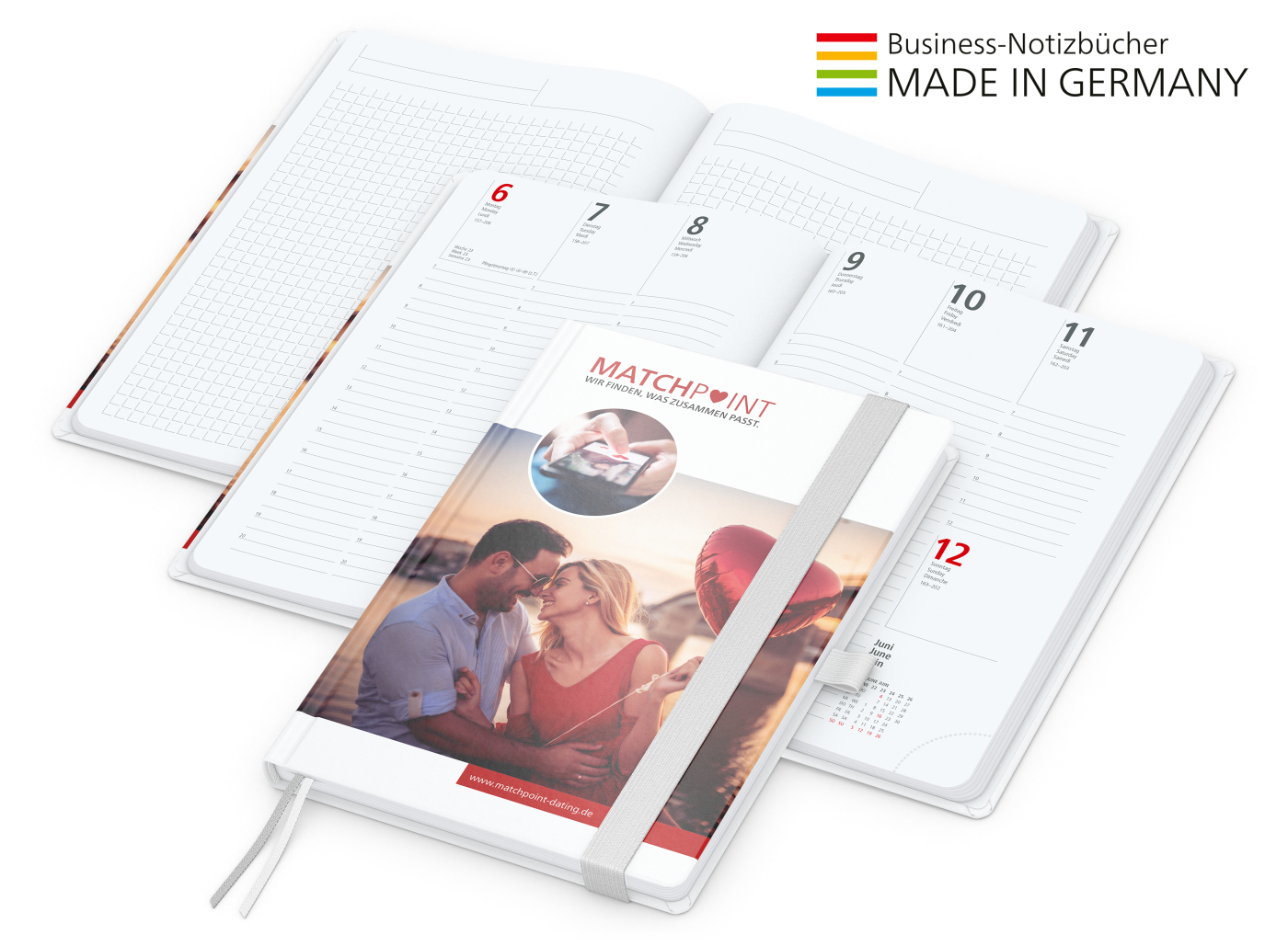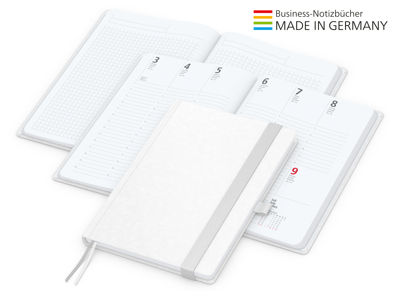 Der Hybrid-Timer für jedes Corporate Design. Individuell bedruckter Einband kombiniert mit Gummiband und Stiftschlaufe in Wunschfarbe. Wochenkalendarium Hochweiß über ein Jahr oder für A5 auch in Creme von August 2024 bis Dezember 2025.
