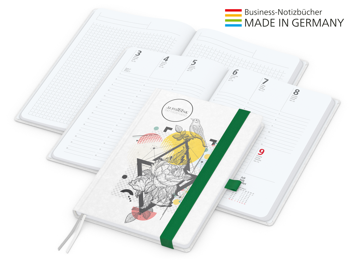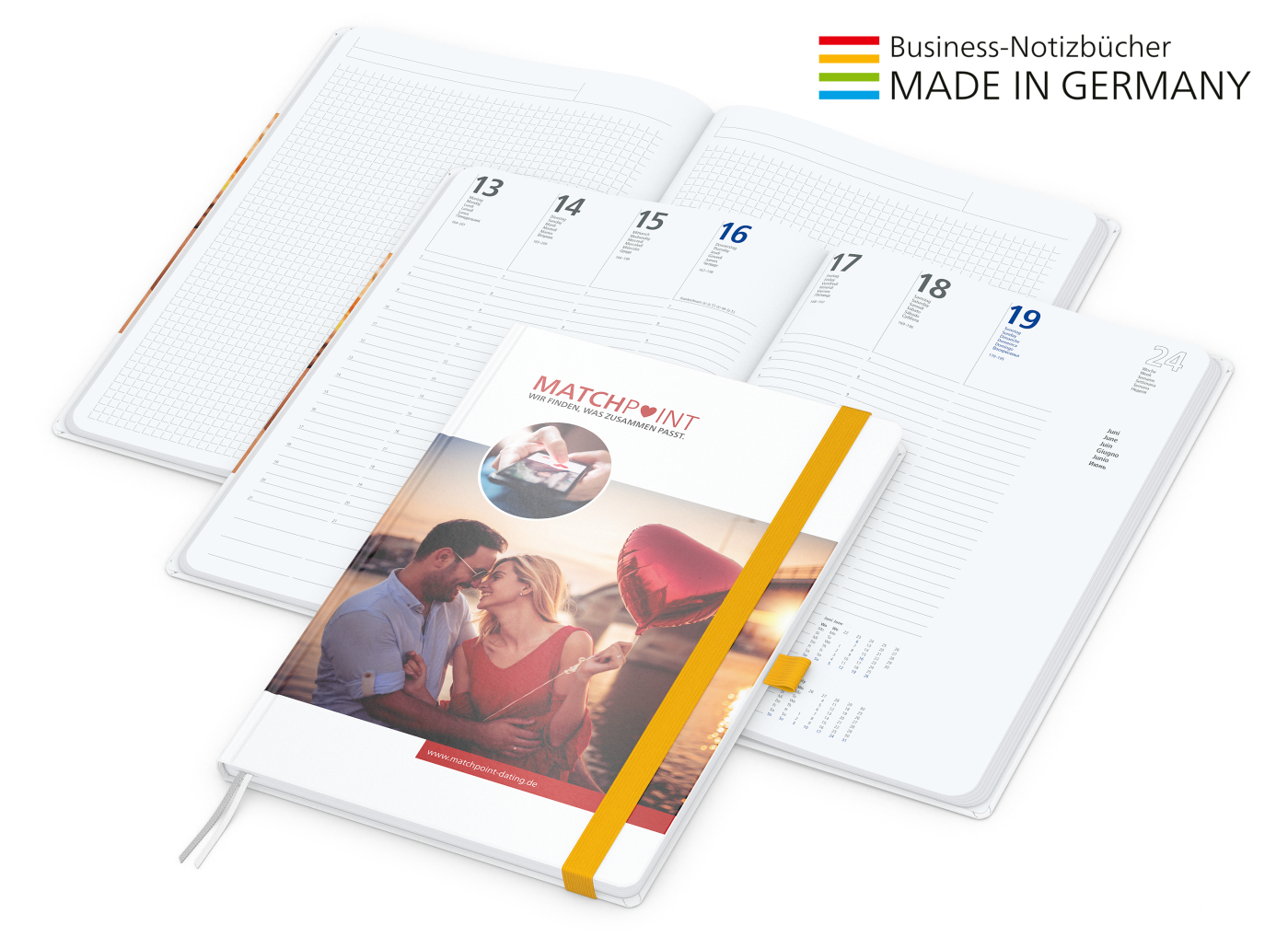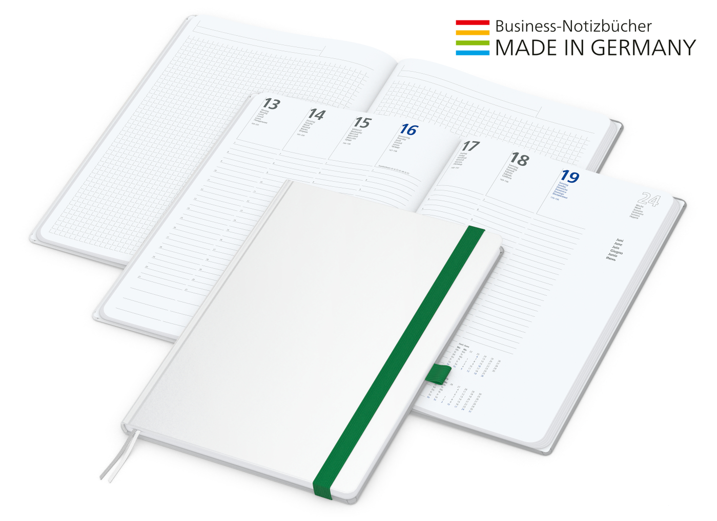 Der Hybrid-Timer für jedes Corporate Design. Individuell bedruckter Einband kombiniert mit Gummiband und Stiftschlaufe in Wunschfarbe. Wochenkalendarium Hochweiß über ein Jahr oder für A5 auch in Creme von August 2024 bis Dezember 2025.
