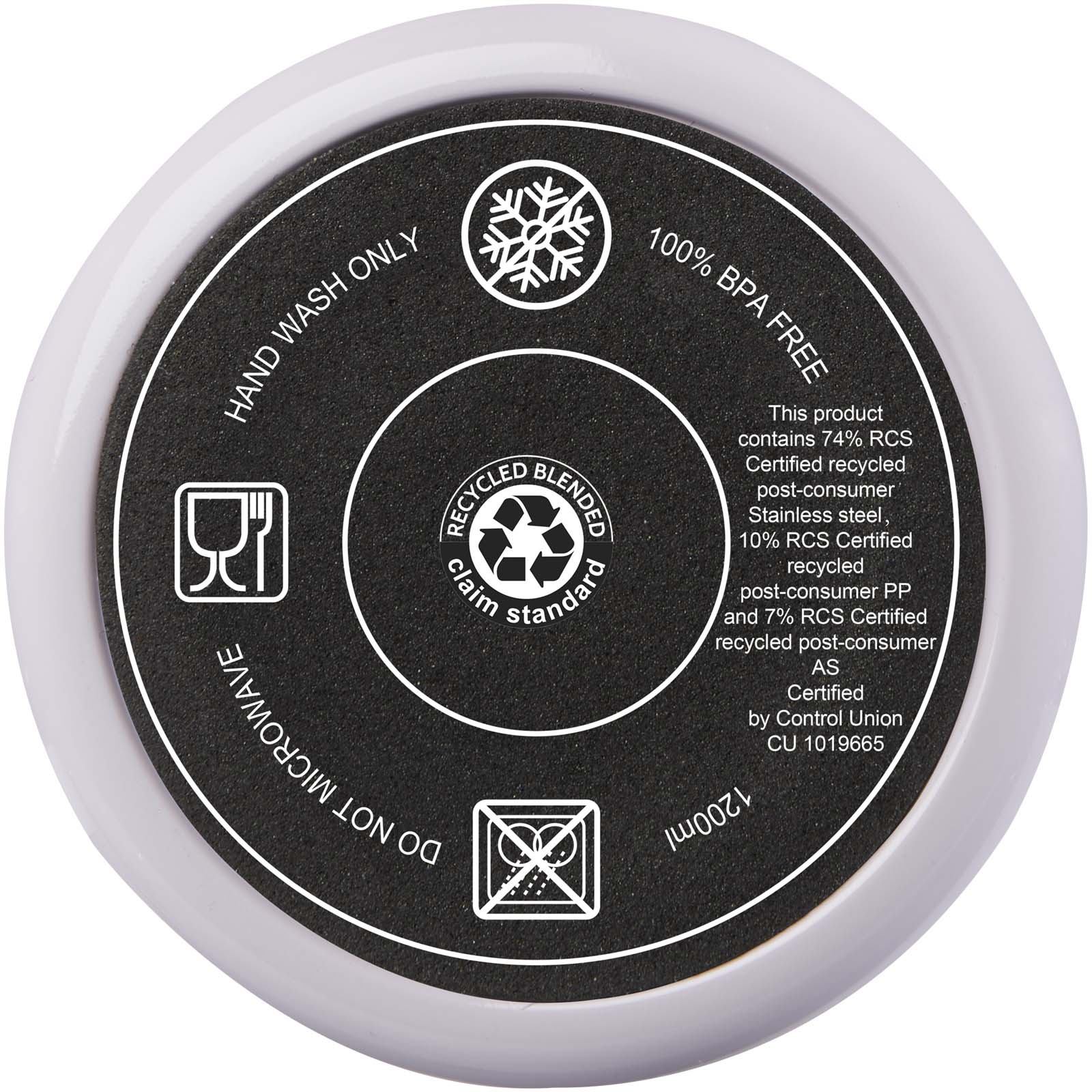 Eine großartige Lösung auf der Suche nach nachhaltigem Trinkgeschirr! Dieser doppelwandige Isolierbecher besteht aus 100 % recyceltem Material, das vollständig recycelbar ist. Er wird mit einem drehbaren Deckel geliefert und ist von innen schwarz. Aufgrund der Beschaffenheit von recyceltem Kunststoff kann es zu kleinen farblichen Nuancen und Farbabweichungen kommen. Das Fassungsvermögen beträgt 350 ml. Hergestellt in UK. Verpackt in einem recycelten PE-Kunststoffbeutel. BPA-frei.Besonderheiten:- Kapazität in Millilitern: 350- Zusätzliche Eigenschaften von Trinkgefäßen: Leicht zu reinigen- Verwendungszweck des Trinkgefäßes: Heiße Getränke- Art der Isolierung: Luftisolierung- Eigenschaften des Deckels: Schraubverschluss- SMETAMaterial: Recycelter PP KunststoffGewicht: 122 gGröße: 15,4 x Ø 9,45 cmStandard-Druck---------------Druckart: SiebrundumDruckposition: rundumDruckgröße: 228 x 73 mm mm (BxH)Druckfarben maximal: 4Zusätzliche Informationen: Aufgrund der hausinternen Versorgung mit recycelten Materialien gilt aktuell eine maximale Bestellmenge von 3.000 Stück pro Auftrag.Suchwörter: Americano, recycled, 350 ml, insulated, tumbler, drinkware, Tumbler, Tumblers, Travel Tumbler, Travel Tumblers, Insulating tumbler, Insulating tumblers, thermos tumbler, thermos tumblers, Drink, Drinks, drinkware,