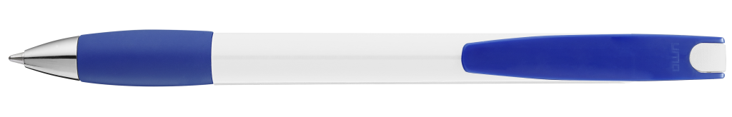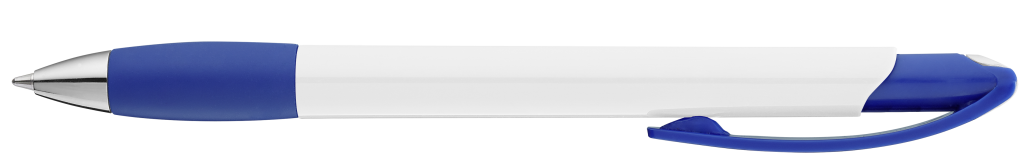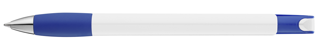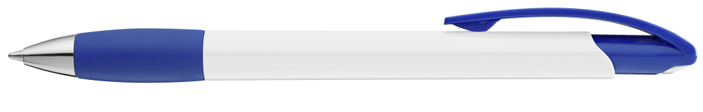 Druckkugelschreiber mit gedeckt glänzendem Gehäuse in weiß, farbiger Gummigriffzone und Clipdrücker. Drückerstopfen und Spitze in silber glänzend.