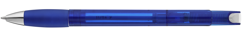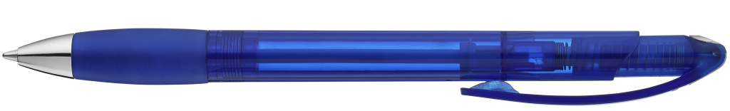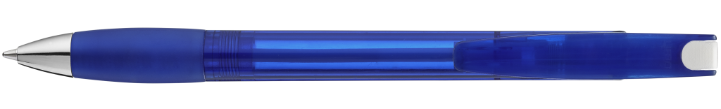 Druckkugelschreiber mit transparent glänzendem Gehäuse, Gummigriffzone und Clipdrücker. Drückerstopfen und Spitze silber glänzend.Druckbereich: In Clipverlängerung 36mm x 20mm Siebdruck (S), seitlich vom Clip 60mm x 13mm Siebdruck (S), gegenüber vom Clip 60mm x 13mm Siebdruck (S), auf dem Clip 35mm x 8mm Tampondruck (T)