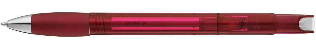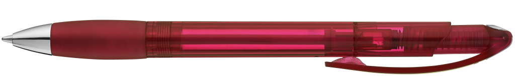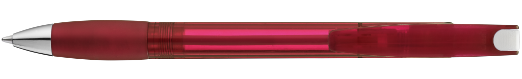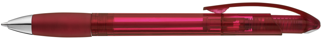 Druckkugelschreiber mit transparent glänzendem Gehäuse, Gummigriffzone und Clipdrücker. Drückerstopfen und Spitze silber glänzend.Druckbereich: In Clipverlängerung 36mm x 20mm Siebdruck (S), seitlich vom Clip 60mm x 13mm Siebdruck (S), gegenüber vom Clip 60mm x 13mm Siebdruck (S), auf dem Clip 35mm x 8mm Tampondruck (T)