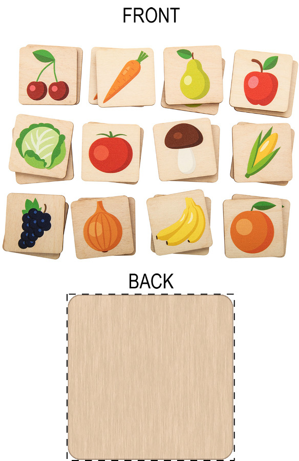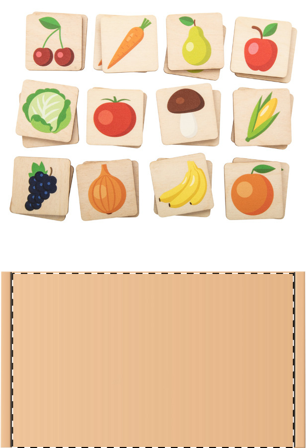 Memory-Spiel aus laminiertertem Birkenholz mit Themen-Motiven. 24 Spielsteine / 12 Motive (40 x 40 mm). Der Preis ist inkl. einem 1-C Logodruck auf der Rückseite aller Spielsteine. Mindestmenge: 50 Stk.