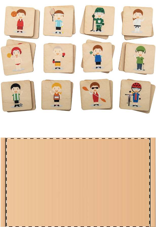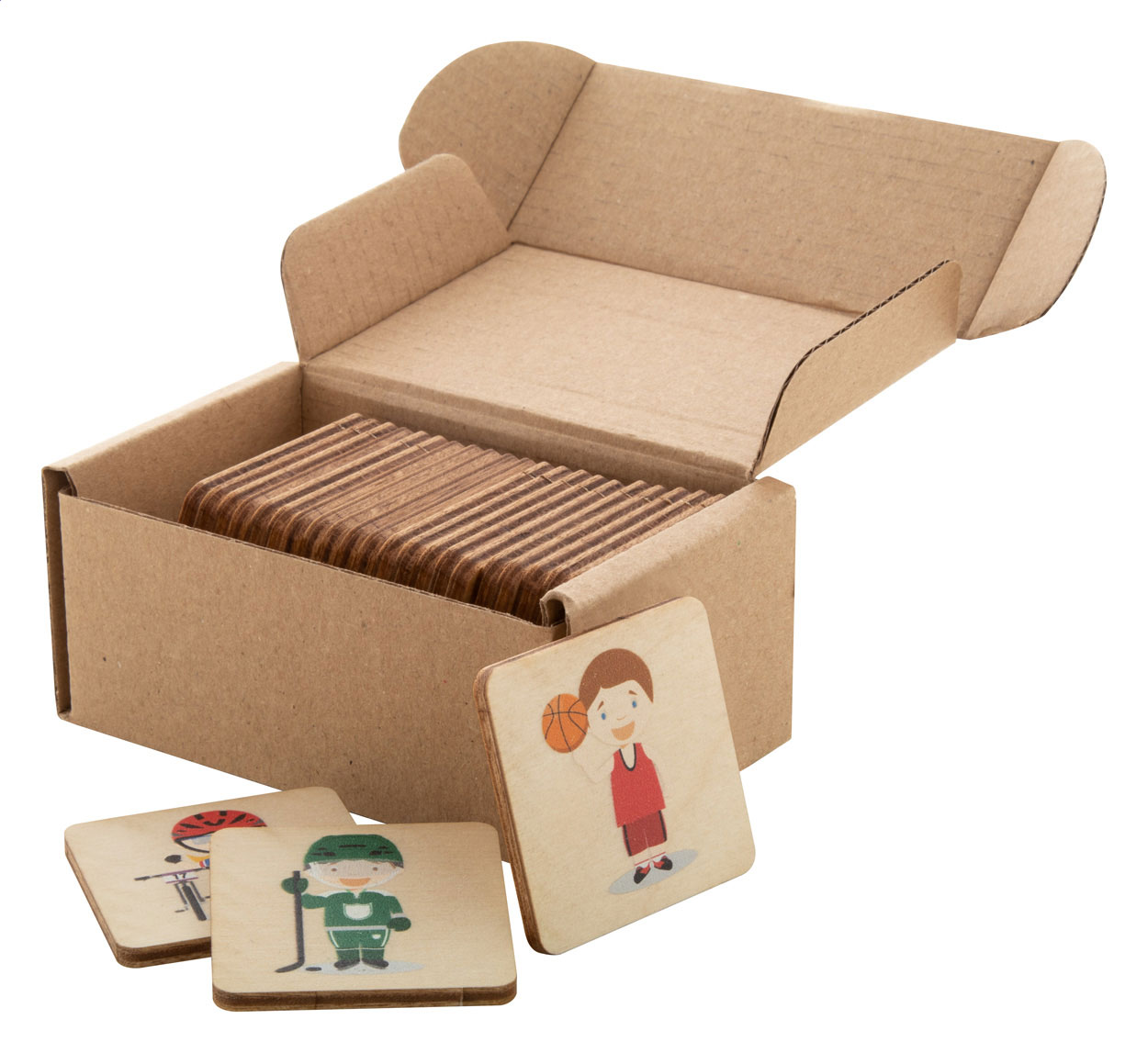 Memory-Spiel aus laminiertertem Birkenholz mit Themen-Motiven. 24 Spielsteine / 12 Motive (40 x 40 mm). Der Preis ist inkl. einem 1-C Logodruck auf der Rückseite aller Spielsteine. Mindestmenge: 50 Stk.