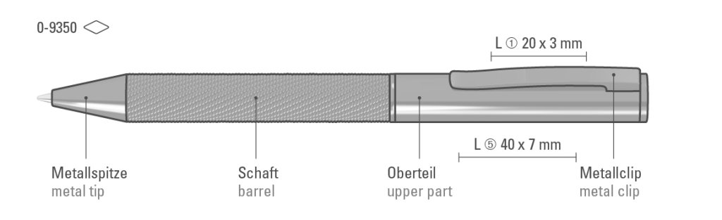 Druckbereich: Auf dem Clip 20mm x 3mm Lasergravur (L), auf der Kappe/auf dem Oberteil 40mm x 7mm Lasergravur (L), auf dem Clip 20mm x 3mm Einzelnamensgravur (EL), auf der Kappe/auf dem Oberteil 40mm x 7mm Einzelnamensgravur (EL)