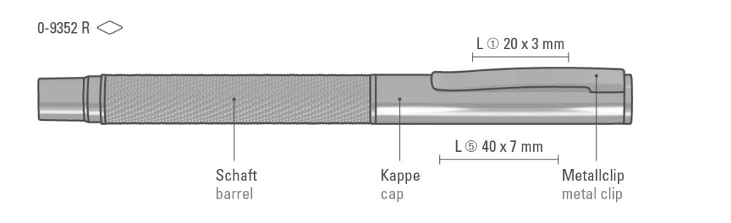 Druckbereich: Auf dem Clip 20mm x 3mm Lasergravur (L), auf der Kappe/auf dem Oberteil 40mm x 7mm Lasergravur (L), auf dem Clip 20mm x 3mm Einzelnamensgravur (EL), auf der Kappe/auf dem Oberteil 40mm x 7mm Einzelnamensgravur (EL)