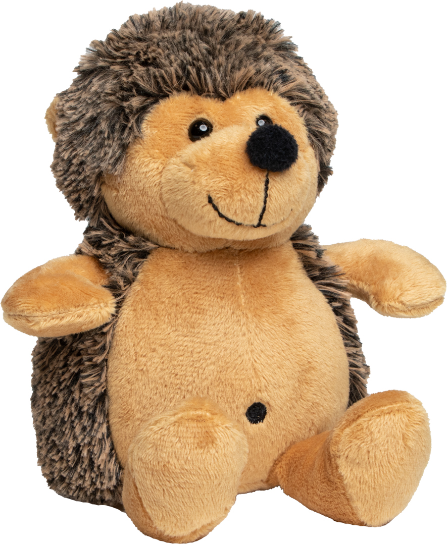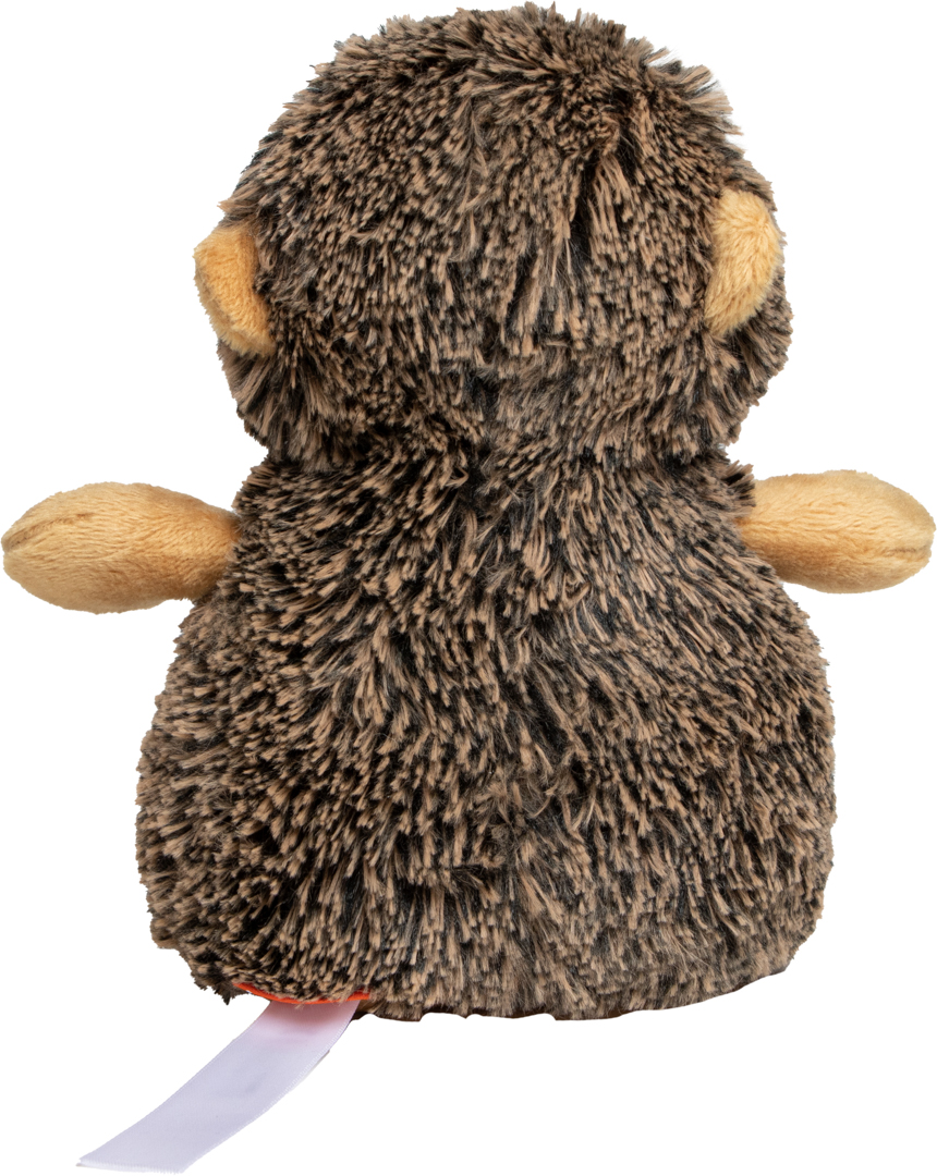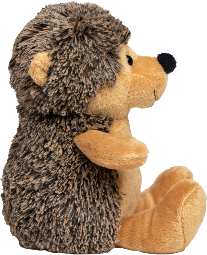 Unser Carsten rollt sich nicht zusammen, denn er hat keine Angst vor Kuscheleinheiten. Eigentlich haben Igel ja nur am Bauch und Gesicht Haare, rund um die immer feuchte Nase (die bei Carsten äußerst prägnant ist), um die dunklen Knopfaugen und um die Ohren herum, der Rest ist stachelig. Aber seine Stacheln tun natürlich nur so als ob: Langer Plüsch in zwei Farben sorgt durch die Melierung für den „Stachel-Look“.