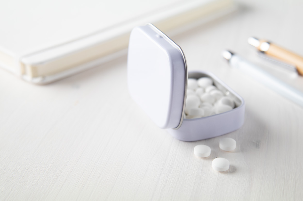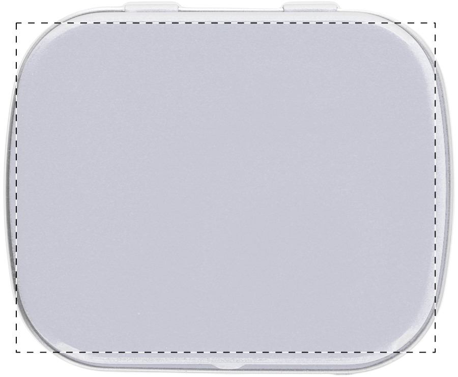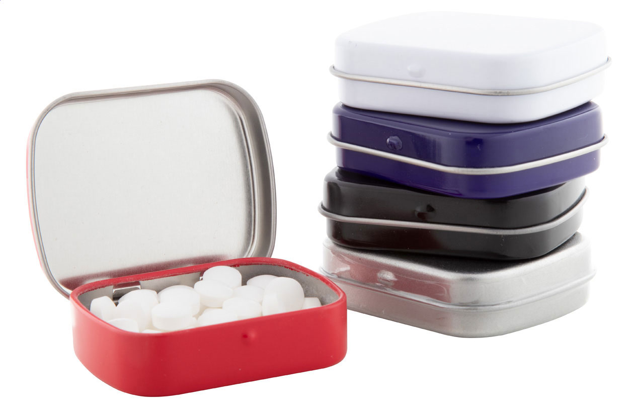 Rechteckige Minzdose aus Blech mit ca. 25 g Minzbonbons.
