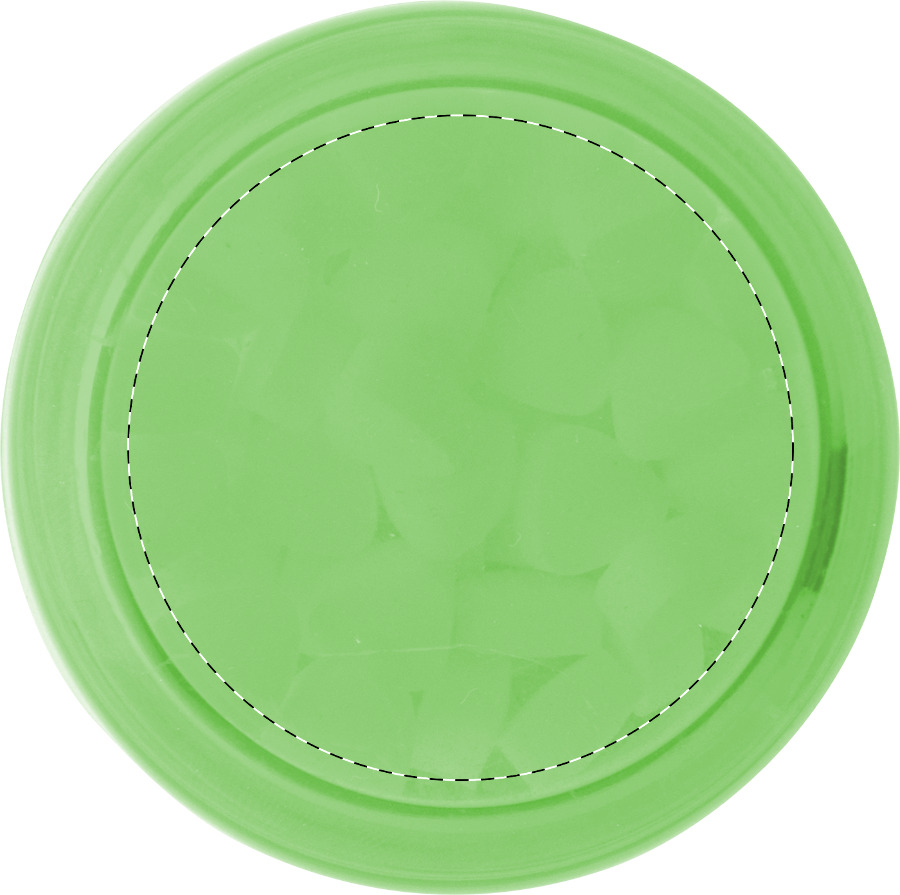 Rundes, transparentes Kunststoff-Minzglas mit farbigem Schraubdeckel. Enthält ca. 12 Gramm zuckerfreie Menthol-Bonbons.Maße: ø45×25 mmMaterial: KunststoffVeredelungsposition 1: ObenTechnologie: UV-LED-Druck - EinzelnamenDurchmesser: 30Druckcode: NUVBTechnologie: TampondruckMaximale Farben: 4Durchmesser: 30Druckcode: P1Technologie: UV LED DruckDurchmesser: 30Druckcode: UVBVeredelungsposition 2: KappeTechnologie: DomingDurchmesser: 36Druckcode: DO3