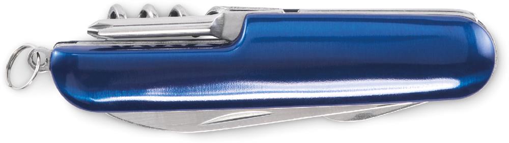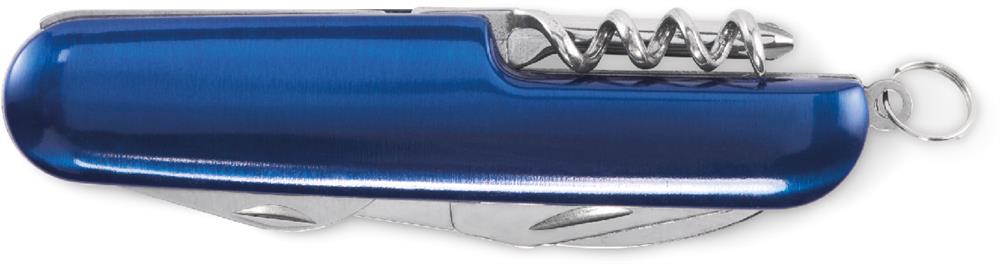 Multi-Tool-Taschenmesser aus recyceltem Aluminium. 5 Funktionen: Große Klinge, Kapselheber, Schraubendreher, Korkenzieher und Dosenöffner.