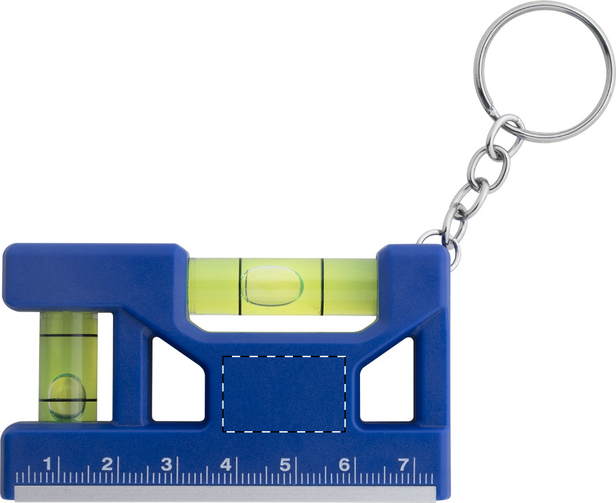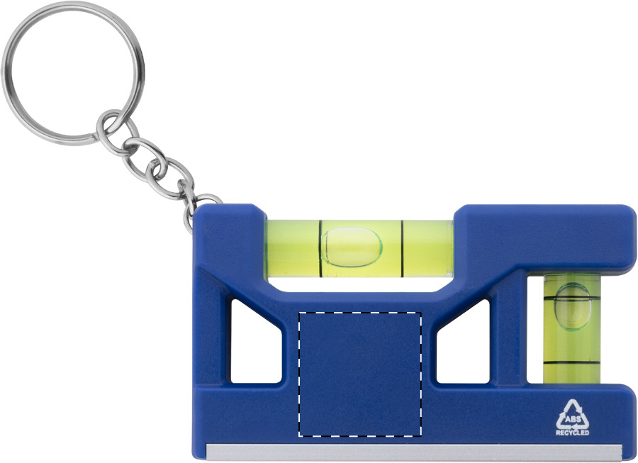 Multifunktionaler Schlüsselanhänger aus recyceltem ABS mit Metallring, Lineal, Magnet und zwei Wasserwaagen.