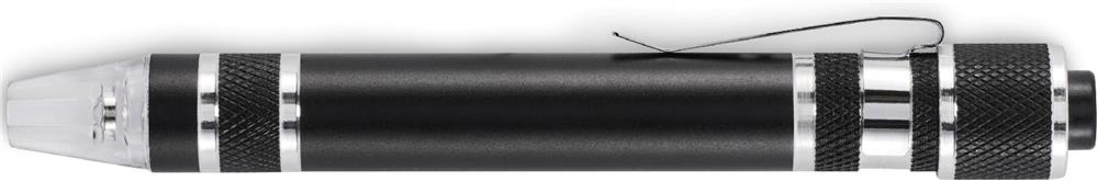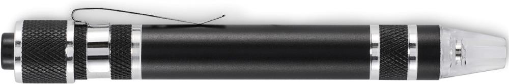 Multitool in Form eines Stiftes aus recyceltem Aluminium. Inkl. 3 Schlitz- und 3 Phillips-Schraubendreherköpfen und Taschenlampe. Inkl. 4 Knopfzellen LR41.